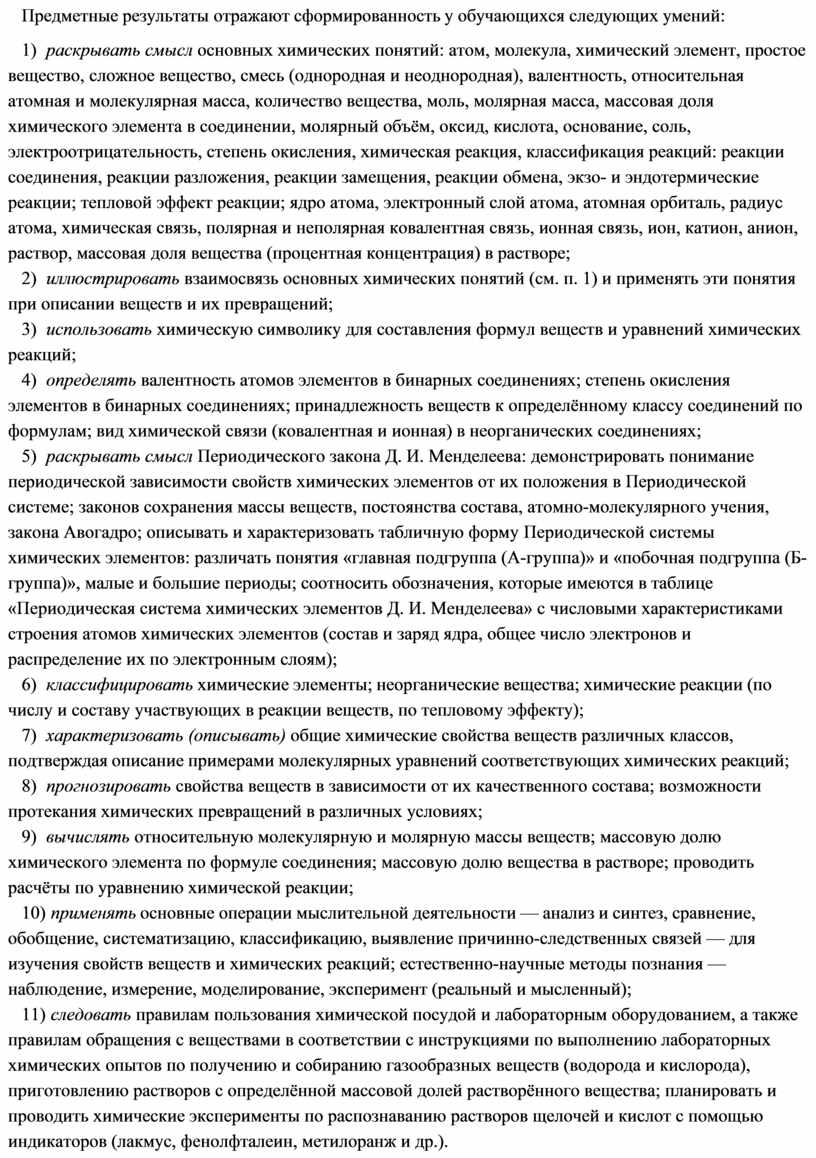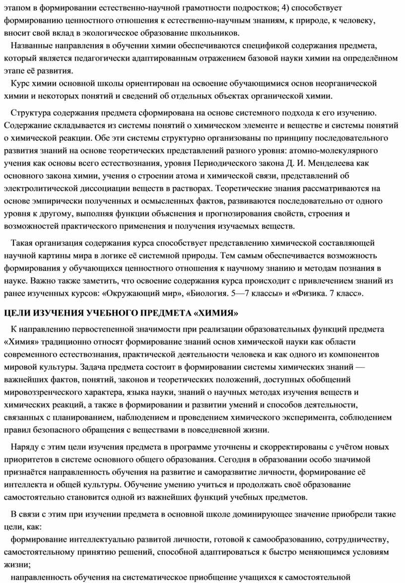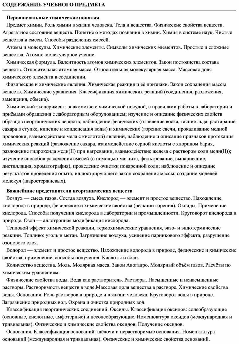 Такая организация содержания курса способствует представлению химической составляющей научной картины мира в логике её системной природы. Тем самым обеспечивается возможность формирования у обучающихся ценностного отношения к научному знанию и методам познания в науке. Важно также заметить, что освоение содержания курса происходит с привлечением знаний из ранее изученных курсов: «Окружающий мир», «Биология. 5—7 классы» и «Физика. 7 класс».
