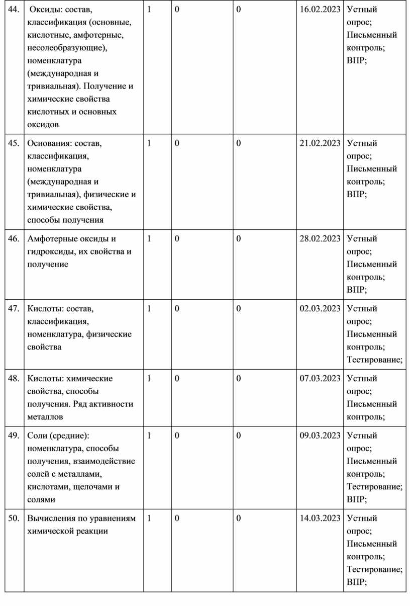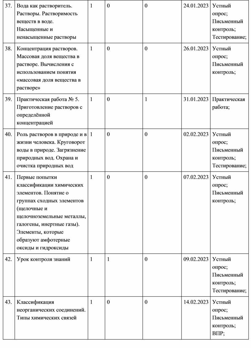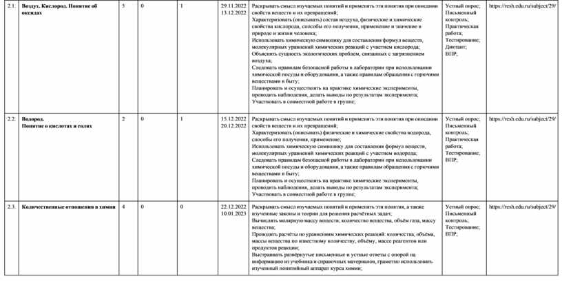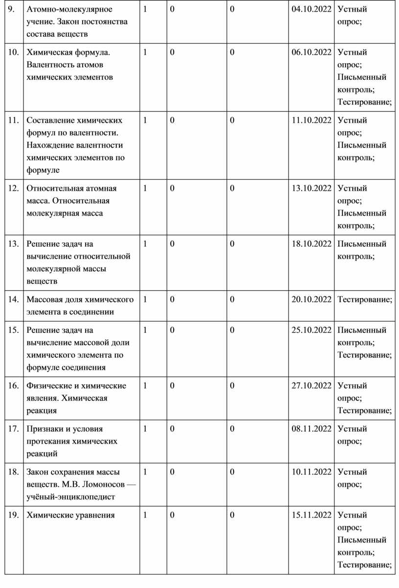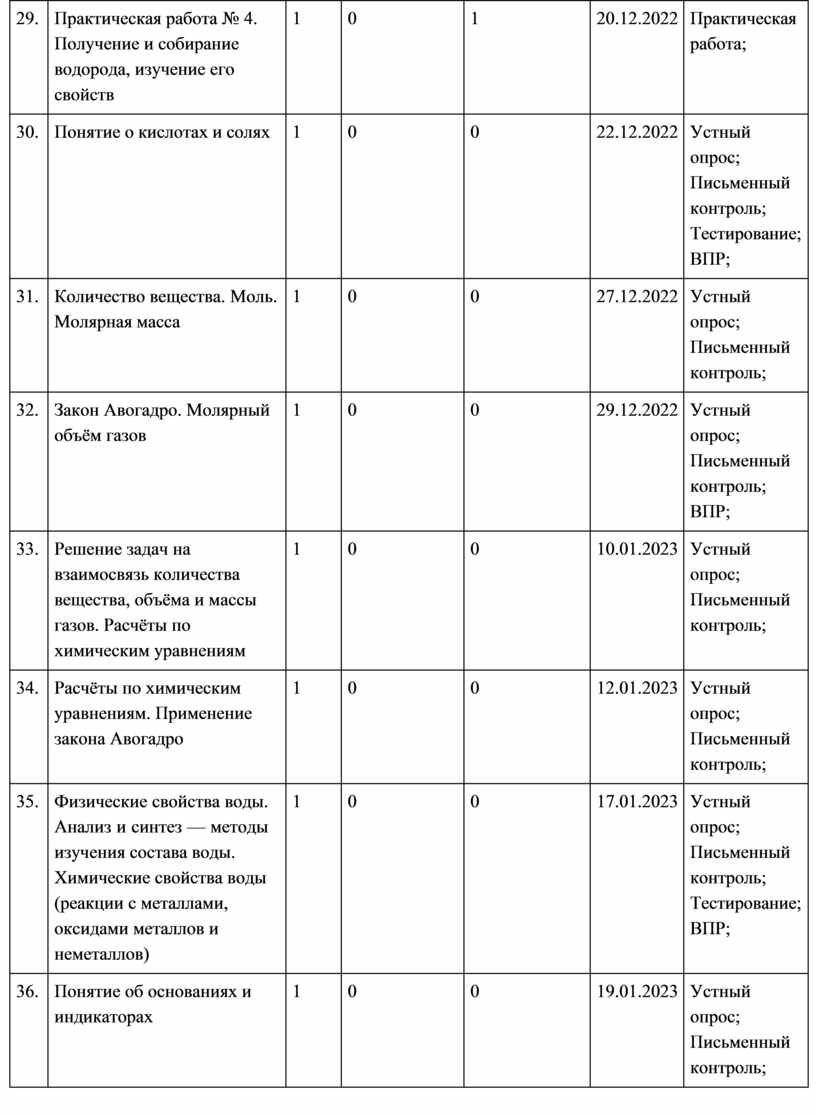 Химический эксперимент: качественное определение содержания кислорода в воздухе; получение, собирание, распознавание и изучение свойств кислорода; наблюдение взаимодействия веществ с кислородом и условия возникновения и прекращения горения (пожара); ознакомление с образцами оксидов и описание их свойств; получение, собирание, распознавание и изучение свойств водорода (горение); взаимодействие водорода с оксидом меди(II) (возможно использование видеоматериалов); наблюдение образцов веществ количеством 1 моль; исследование особенностей растворения веществ с различной растворимостью; приготовление растворов с определённой массовой долей растворённого вещества; взаимодействие воды с металлами (натрием и кальцием) (возможно использование видеоматериалов); определение растворов кислот и щелочей с помощью индикаторов; исследование образцов неорганических веществ различных классов; наблюдение изменения окраски индикаторов в растворах кислот и щелочей; изучение взаимодействия оксида меди(II) с раствором серной кислоты, кислот с металлами, реакций нейтрализации; получение нерастворимых оснований, вытеснение одного металла другим из раствора соли; решение экспериментальных задач по теме