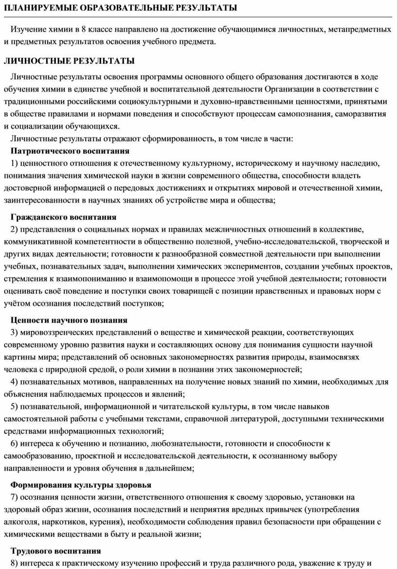 Изучение химии в 8 классе направлено на достижение обучающимися личностных, метапредметных и предметных результатов освоения учебного предмета.