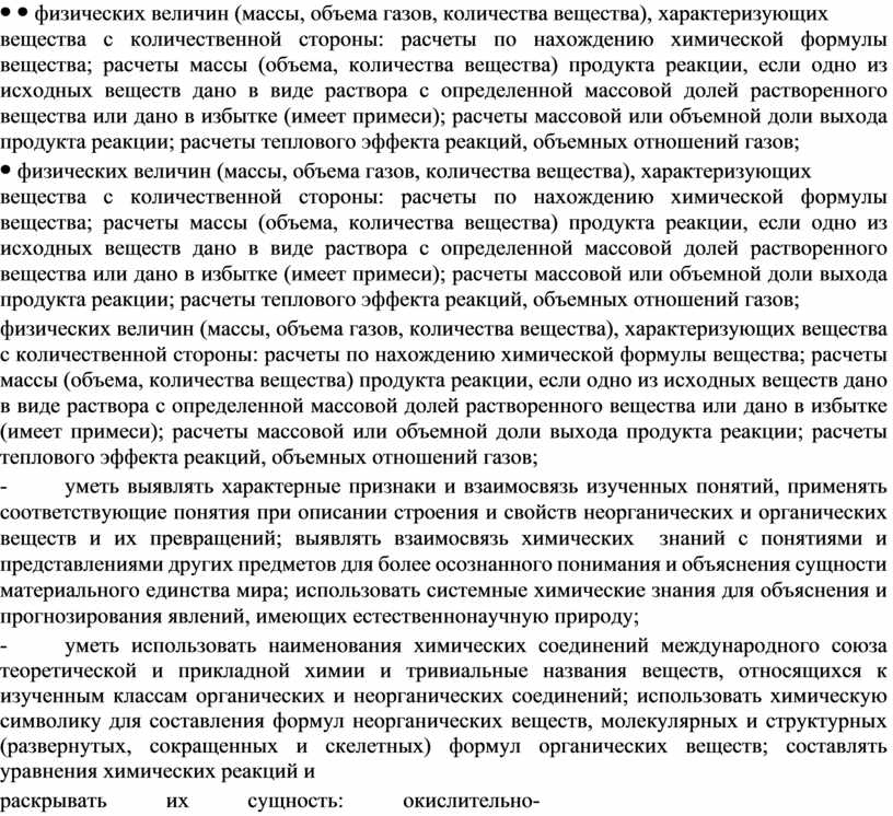физических величин (массы, объема газов, количества вещества), характеризующих вещества с количественной стороны: расчеты по нахождению химической формулы вещества; расчеты массы (объема, количества вещества) продукта реакции, если одно из исходных веществ дано в виде раствора с определенной массовой долей растворенного вещества или дано в избытке (имеет примеси); расчеты массовой или объемной доли выхода продукта реакции; расчеты теплового эффекта реакций, объемных отношений газов; - уметь выявлять характерные признаки и взаимосвязь изученных понятий, применять соответствующие понятия при описании строения и свойств неорганических и органических веществ и их превращений; выявлять взаимосвязь химических знаний с понятиями и представлениями других предметов для более осознанного понимания и объяснения сущности материального единства мира; использовать системные химические знания для объяснения и прогнозирования явлений, имеющих естественнонаучную природу; - уметь использовать наименования химических соединений международного союза теоретической и прикладной химии и тривиальные названия веществ, относящихся к изученным классам органических и неорганических соединений; использовать химическую символику для составления формул неорганических веществ, молекулярных и структурных (развернутых, сокращенных и скелетных) формул органических веществ; составлять уравнения химических реакций и раскрывать их сущность: окислительно- восстановительных реакций посредством составления электронного баланса этих реакций; реакций ионного |