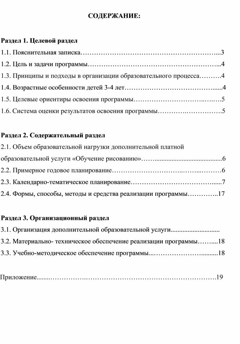 Раздел 2. Содержательный раздел 2.1. Объем образовательной нагрузки дополнительной платной образовательной услуги «Обучение рисованию»……........................................6 2.2. Примерное годовое планирование…………………………..……...………6 2.3. Календарно-тематическое планирование………………………………......7 2.4. Формы, способы, методы и средства реализации программы…………..17 |