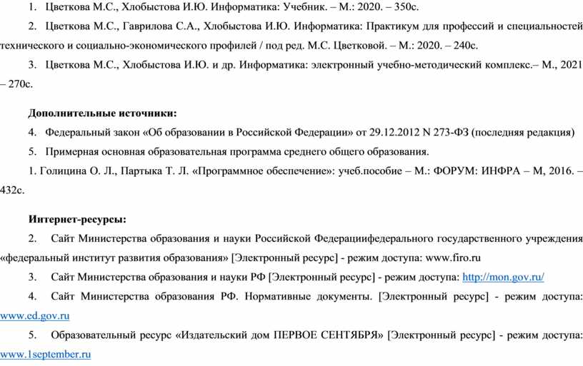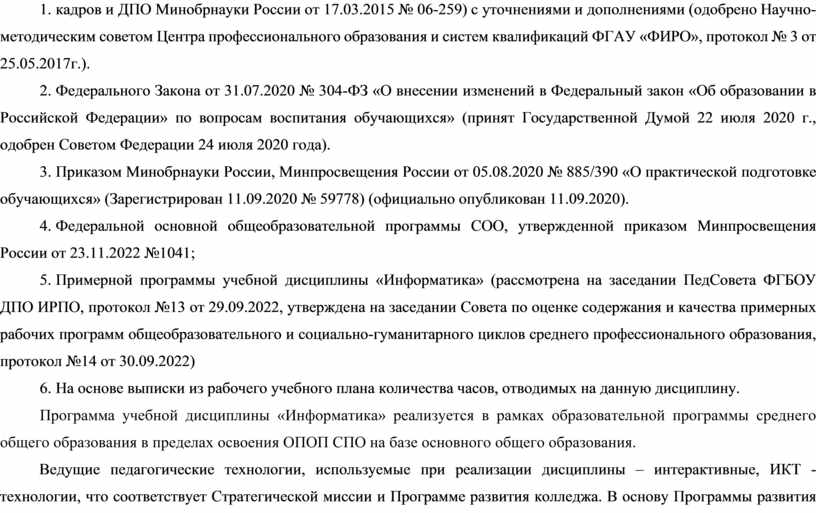 8. Примерной программы учебной дисциплины «Информатика» (рассмотрена на заседании ПедСовета ФГБОУ ДПО ИРПО, протокол №13 от 29.09.2022, утверждена на заседании Совета по оценке содержания и качества примерных рабочих программ общеобразовательного и социально-гуманитарного циклов среднего профессионального образования, протокол №14 от 30.09.2022)