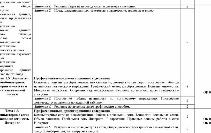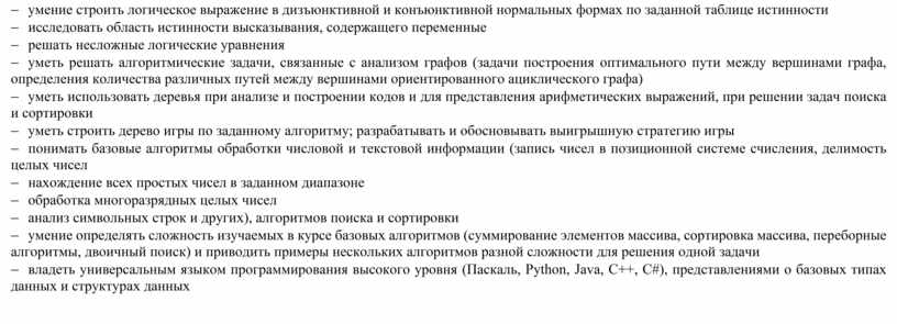 - умение критически оценивать информацию, полученную из сети Интернет - владение навыками работы с операционными системами и основными видами программного обеспечения для решения учебных задач по выбранной специализации - умение определять информационный объем текстовых, графических и звуковых данных при заданных параметрах дискретизации - использование простейших кодов, которые позволяют обнаруживать и исправлять ошибки при передаче данных - выполнение преобразования логических выражений, используя законы алгебры логики - определение кратчайшего пути во взвешенном графе и количество путей между вершинами ориентированного ациклического графа - умение определять среднюю скорость передачи данных, оценивать изменение времени передачи при изменении информационного объема данных и характеристик канала связи - умение использовать при решении задач свойства позиционной записи чисел - умение выполнять арифметические операции в позиционных системах счисления - умение строить логическое выражение в дизъюнктивной и конъюнктивной нормальных формах по заданной таблице истинности - исследование области истинности высказывания, содержащего переменные - решение несложных логических уравнений |