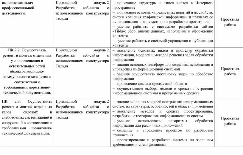 - понимание структуры и типов сайтов в Интернет-пространстве - понимание основных предметных понятий и их свойств, систем хранения графической информации и правилах ее использования знание методики разработки прототипов - умение работать с системами разработки сайтов «Tilda»: сбор, анализ данных, наполнение и оформление контента - умение работать с системой управления и публикации контента |
