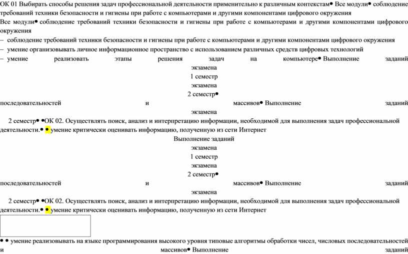 - соблюдение требований техники безопасности и гигиены при работе с компьютерами и другими компонентами цифрового окружения |