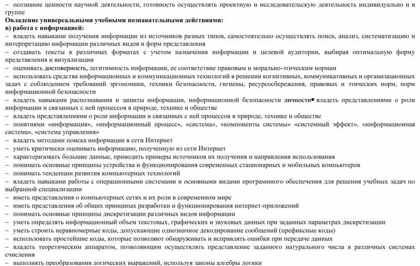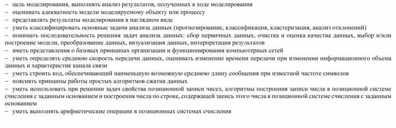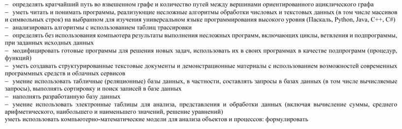 - владеть представлениями о роли информации и связанных с ней процессов в природе, технике и обществе - понятиями «информация», «информационный процесс», «система», «компоненты системы» «системный эффект», «информационная система», «система управления» - владеть методами поиска информации в сети Интернет - уметь критически оценивать информацию, полученную из сети Интернет - характеризовать большие данные, приводить примеры источников их получения и направления использования - понимать основные принципы устройства и функционирования современных стационарных и мобильных компьютеров - понимать тенденции развития компьютерных технологий - владеть навыками работы с операционными системами и основными видами программного обеспечения для решения учебных задач по выбранной специализации - иметь представления о компьютерных сетях и их роли в современном мире - иметь представления об общих принципах разработки и функционирования интернет-приложений - понимать основные принципы дискретизации различных видов информации - уметь определять информационный объем текстовых, графических и звуковых данных при заданных параметрах дискретизации - уметь строить неравномерные коды, допускающие однозначное декодирование сообщений (префиксные коды) - использовать простейшие коды, которые позволяют обнаруживать и исправлять ошибки при передаче данных - владеть теоретическим аппаратом, позволяющим осуществлять представление заданного натурального числа в различных системах счисления - выполнять преобразования логических выражений, используя законы алгебры логики - определять кратчайший путь во взвешенном графе и количество путей между вершинами ориентированного ациклического графа - уметь читать и понимать программы, реализующие несложные алгоритмы обработки числовых и текстовых данных (в том числе массивов и символьных строк) на выбранном для изучения универсальном языке программирования высокого уровня (Паскаль, Python, Java, С++, С#) - анализировать алгоритмы с использованием таблиц трассировки - определять без использования компьютера результаты выполнения несложных программ, включающих циклы, ветвления и подпрограммы, при заданных исходных данных - модифицировать готовые программы для решения новых задач, использовать их в своих программах в качестве подпрограмм (процедур, функций) - уметь создавать структурированные текстовые документы и демонстрационные материалы с использованием возможностей современных программных средств и облачных сервисов - умение использовать табличные (реляционные) базы данных, в частности, составлять запросы в базах данных (в том числе вычисляемые запросы), выполнять сортировку и поиск записей в базе данных - наполнять разработанную базу данных - умение использовать электронные таблицы для анализа, представления и обработки данных (включая вычисление суммы, среднего арифметического, наибольшего и наименьшего значений, решение уравнений) - уметь использовать компьютерно-математические модели для анализа объектов и процессов: формулировать цель моделирования, выполнять анализ результатов, полученных в ходе моделирования - оценивать адекватность модели моделируемому объекту или процессу - представлять результаты моделирования в наглядном виде - уметь классифицировать основные зада