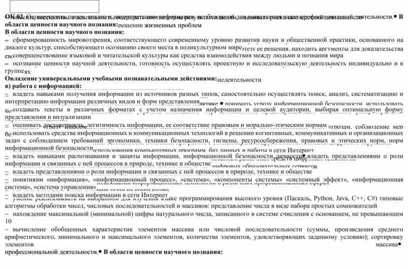 - понимать угрозу информационной безопасности, использовать методы и средства противодействия этим угрозам, соблюдение мер безопасности, предотвращающих незаконное распространение персональных данных - соблюдение требований техники безопасности и гигиены при работе с компьютерами и другими компонентами цифрового окружения - понимание правовых основ использования компьютерных программ, баз данных и работы в сети Интернет - уметь организовывать личное информационное пространство с использованием различных средств цифровых технологий - понимание возможностей цифровых сервисов государственных услуг, цифровых образовательных сервисов - понимание возможностей и ограничений технологий искусственного интеллекта в различных областях - наличие представлений об использовании информационных технологий в различных профессиональных сферах - уметь реализовать этапы решения задач на компьютере - умение реализовывать на выбранном для изучения языке программирования высокого уровня (Паскаль, Python, Java, С++, С#) типовые алгоритмы обработки чисел, числовых последовательностей и массивов: представление числа в виде набора простых сомножителей - нахождение максимальной (минимальной) цифры натурального числа, записанного в системе счисления с основанием, не превышающим 10 - вычисление обобщенных характеристик элементов массива или числовой последовательности (суммы, произведения среднего арифметического, минимального и максимального элементов, количества элементов, удовлетворяющих заданному условию); сортировку элементов массива |