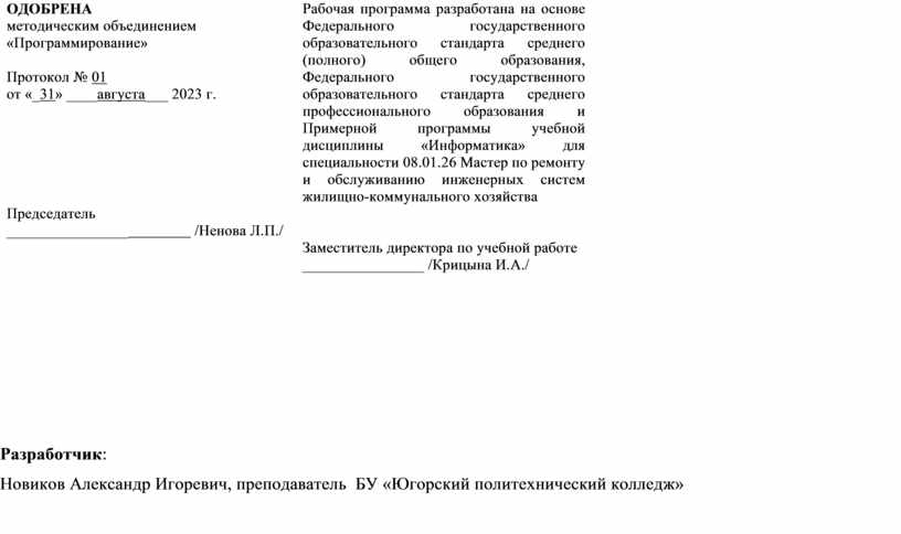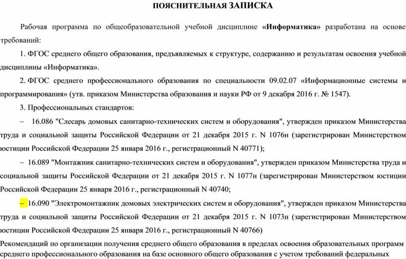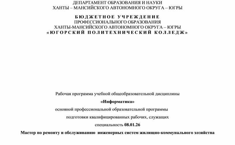 Рабочая программа разработана на основе Федерального государственного образовательного стандарта среднего (полного) общего образования, Федерального государственного образовательного стандарта среднего профессионального образования и Примерной программы учебной дисциплины «Информатика» для специальности 08.01.26 Мастер по ремонту и обслуживанию инженерных систем жилищно-коммунального хозяйства