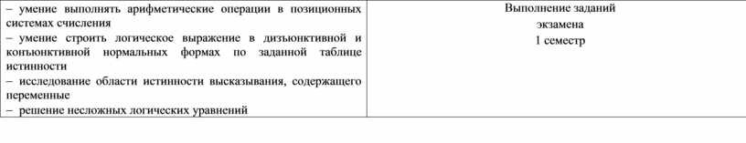 - выполнение преобразований логических выражений с использованием законов алгебры логики - умение строить логическое выражение в дизъюнктивной и конъюнктивной нормальных формах по заданной таблице истинности - исследование область истинности высказывания, содержащего переменные - решение несложных логических уравнений |