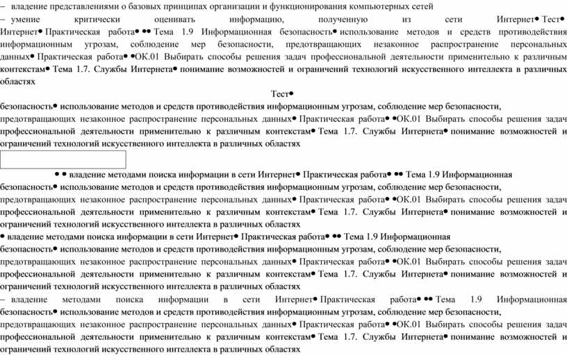 - понимание правовых основ использования компьютерных программ, баз данных и работы в сети Интернет |