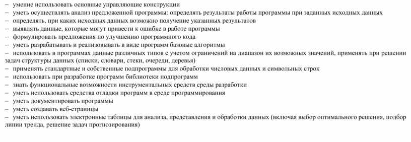 - умение читать и понимать программы, реализующие несложные алгоритмы обработки числовых и текстовых данных (в том числе массивов и символьных строк) на универсальном языке - умение анализировать алгоритмы с использованием таблиц трассировки - умение определять без использования компьютера результаты выполнения несложных программ, включающих циклы, ветвления и подпрограммы, при заданных исходных данных - умение модифицировать готовые программы для решения новых задач, использовать их в своих программах в качестве подпрограмм (процедур, функций) - умение создавать структурированные текстовые документы с использованием возможностей современных программных средств - умение использовать табличные (реляционные) базы данных - выполнение сортировки и поиска записей в базе данных - умение использовать электронные таблицы для анализа, представления и обработки данных - умение решать алгоритмические задачи, связанные с анализом графов - умение разрабатывать и реализовывать в виде программ базовые алгоритмы - умение использовать средства отладки программ в среде программирования - умение использовать электронные таблицы для анализа, представления и обработки данных |