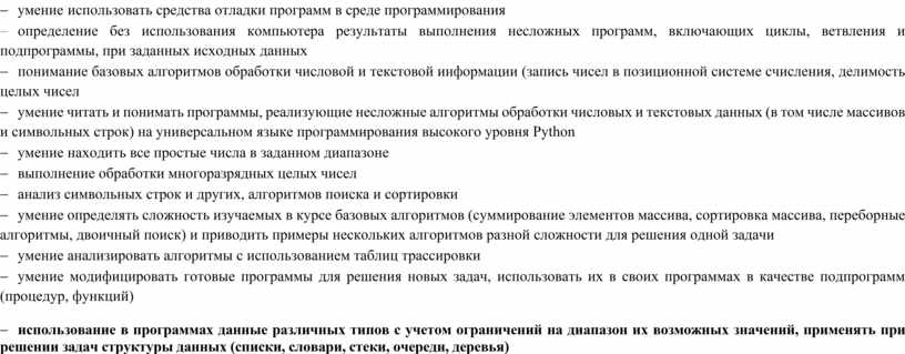 - владение универсальным языком программирования высокого уровня (Python), представлениями о базовых типах данных и структурах данных - умение использовать основные управляющие конструкции - умение осуществлять анализ предложенной программы: определять результаты работы программы при заданных исходных данных - умение разрабатывать и реализовывать в виде программ базовые алгоритмы - знание функциональных возможностей инструментальных средств среды разработки - умение использовать средства отладки программ в среде программирования - определение без использования компьютера результаты выполнения несложных программ, включающих циклы, ветвления и подпрограммы, при заданных исходных данных - понимание базовых алгоритмов обработки числовой и текстовой информации (запись чисел в позиционной системе счисления, делимость целых чисел - умение читать и понимать программы, реализующие несложные алгоритмы обработки числовых и текстовых данных (в том числе массивов и символьных строк) на универсальном языке программирования высокого уровня Python - умение находить все простые числа в заданном диапазоне - выполнение обработки многоразрядных целых чисел - анализ символьных строк и других, алгоритмов поиска и сортировки - умение определять сложность изучаемых в курсе базовых алгоритмов (суммирование элементов массива, сортировка массива, переборные алгоритмы, двоичный поиск) и приводить примеры нескольких алгоритмов разной сложности для решения одной задачи - умение анализировать алгоритмы с использованием таблиц трассировки - умение модифицировать готовые программы для решения новых задач, использовать их в своих программах в качестве подпрограмм (процедур, функций) - использование в программах данные различных типов с учетом ограничений на диапазон их возможных значений, применять при решении задач структуры данных (списки, словари, стеки, очереди, деревья) - применение стандартных и собственных подпрограммы для обработки числовых данных и символьных строк - использование при разработке программ библиотеки подпрограмм - выявление данных, которые могут привести к ошибке в работе программы - умение формулировать предложения по улучшению программного кода - умение документировать программы |