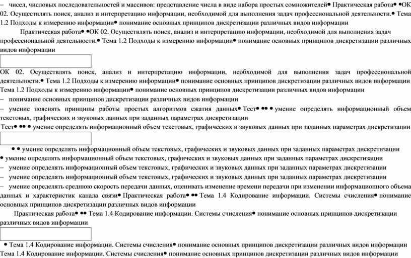 - понимание основных принципов дискретизации различных видов информации - владение теоретическим аппаратом, позволяющим осуществлять представление заданного натурального числа в различных системах счисления |