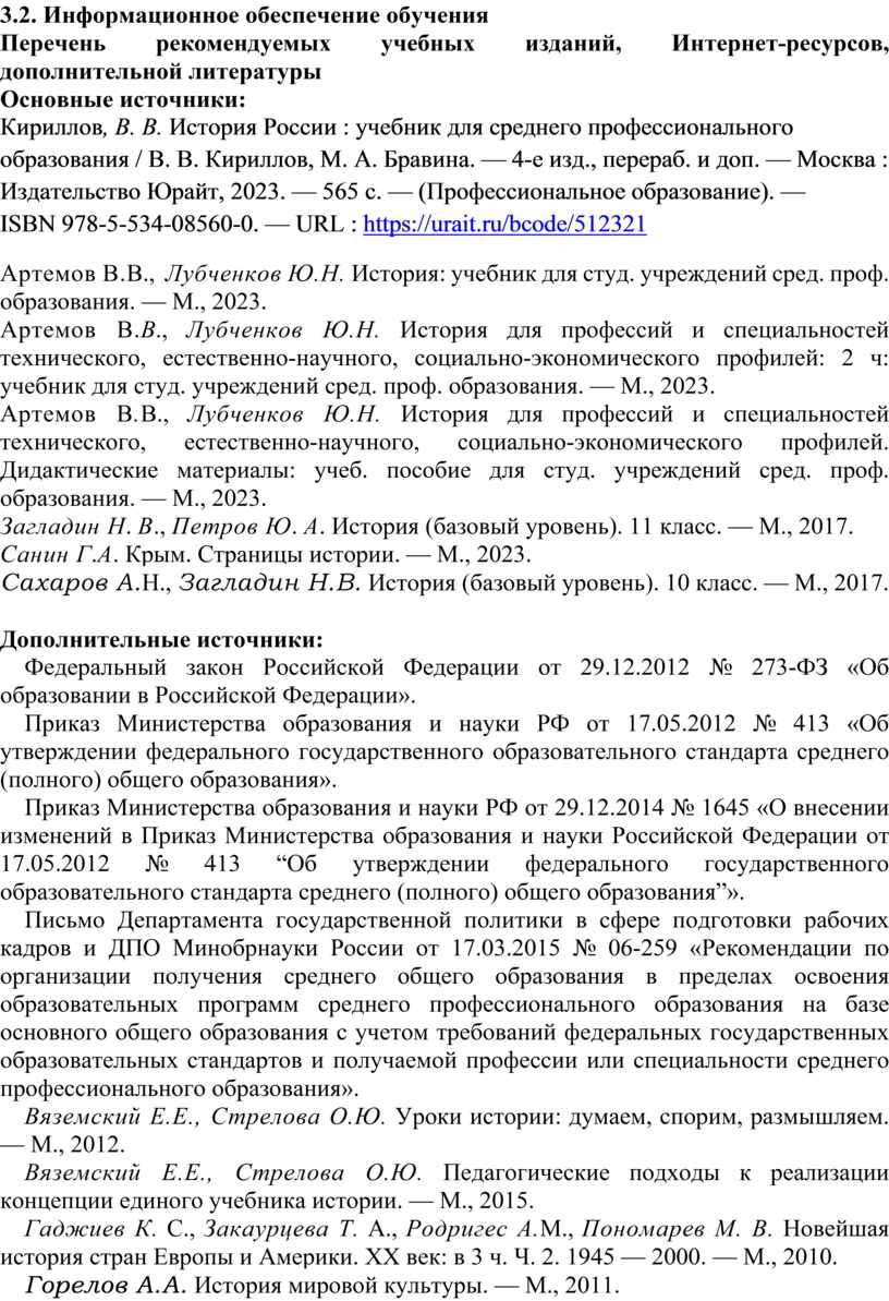 Артемов В.В., Лубченков Ю.Н. История для профессий и специальностей технического, естественно-научного, социально-экономического профилей. Дидактические материалы: учеб. пособие для студ. учреждений сред. проф. образования. — М., 2023.