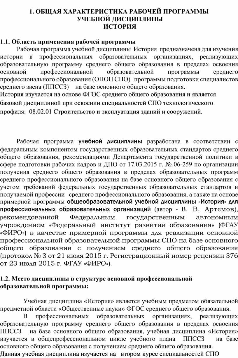 Рабочая программа учебной дисциплины разработана в соответствии с федеральным компонентом государственных образовательных стандартов среднего общего образования, рекомендациями Департамента государственной политики в сфере подготовки рабочих кадров и ДПО от 17.03.2015 г. № 06-259 по организации получения среднего общего образования в пределах образовательных программ среднего профессионального образования на базе основного общего образования с учетом требований федеральных государственных образовательных стандартов и получаемой профессии среднего профессионального образования, а также на основе примерной программы общеобразовательной учебной дисциплины «История» для профессиональных образовательных организаций (автор - В. В. Артемов), рекомендованной Федеральным государственным автономным учреждением «Федеральный институт развития образования» (ФГАУ «ФИРО») в качестве примерной программы для реализации основной профессиональной образовательной программы СПО на базе основного общего образования с получением среднего общего образования (протокол № 3 от 21 июля 2015 г. Регистрационный номер рецензии 376 от 23 июля 2015 г. ФГАУ «ФИРО»).