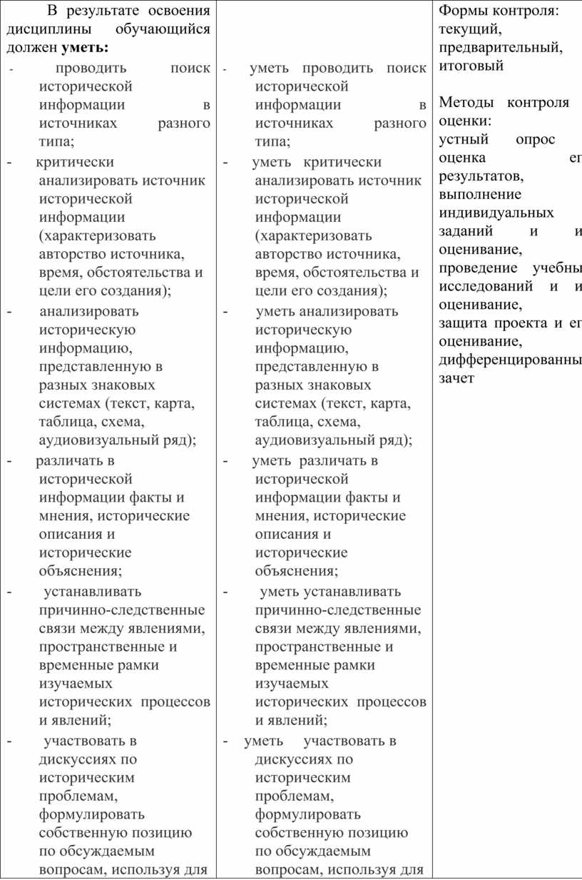 - уметь проводить поиск исторической информации в источниках разного типа; - уметь критически анализировать источник исторической информации (характеризовать авторство источника, время, обстоятельства и цели его создания); - уметь анализировать историческую информацию, представленную в разных знаковых системах (текст, карта, таблица, схема, аудиовизуальный ряд); - уметь различать в исторической информации факты и мнения, исторические описания и исторические объяснения; - уметь устанавливать причинно-следственные связи между явлениями, пространственные и временные рамки изучаемых исторических процессов и явлений; - уметь участвовать в дискуссиях по историческим проблемам, формулировать собственную позицию по обсуждаемым вопросам, используя для аргументации исторические сведения; - уметь представлять результаты изучения исторического материала в формах конспекта, реферата, рецензии;