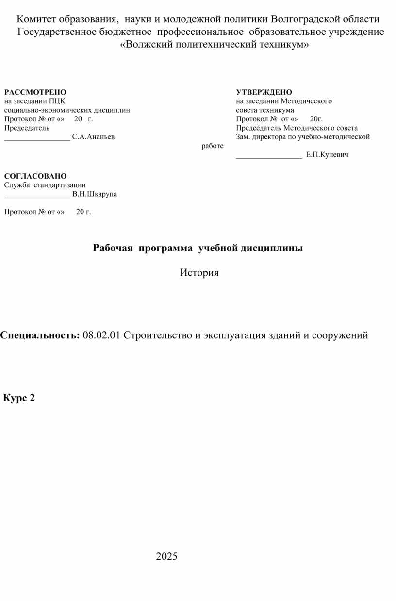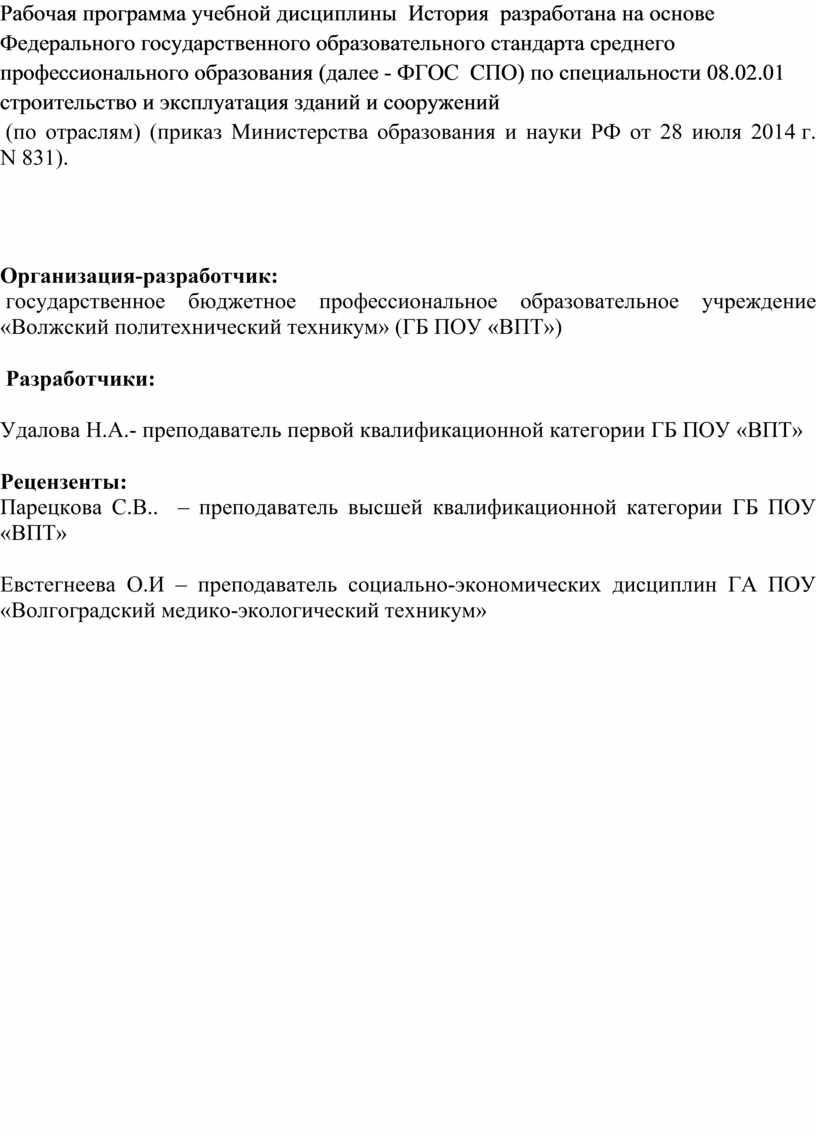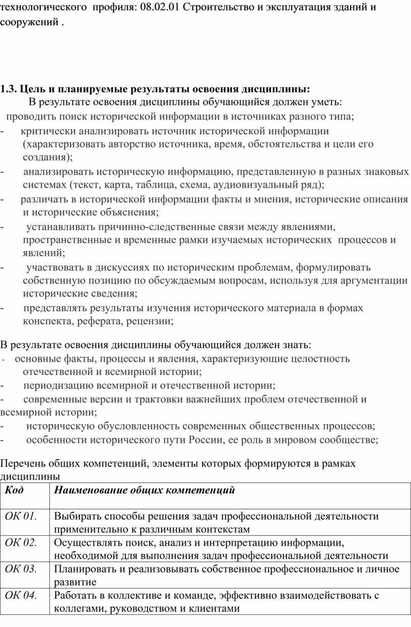 Рабочая программа учебной дисциплины История разработана на основе Федерального государственного образовательного стандарта среднего профессионального образования (далее - ФГОС СПО) по специальности 08.02.01 строительство и эксплуатация зданий и сооружений