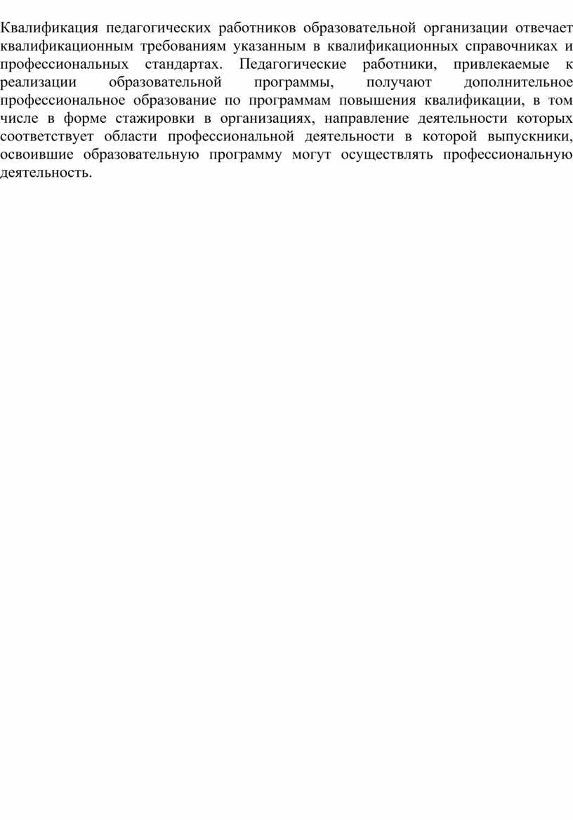 Квалификация педагогических работников образовательной организации отвечает квалификационным требованиям указанным в квалификационных справочниках и профессиональных стандартах. Педагогические работники, привлекаемые к реализации образовательной программы, получают дополнительное профессиональное образование по программам повышения квалификации, в том числе в форме стажировки в организациях, направление деятельности которых соответствует области профессиональной деятельности в которой выпускники, освоившие образовательную программу могут осуществлять профессиональную деятельность.