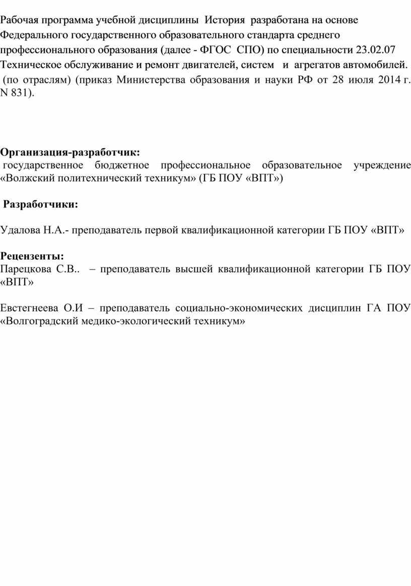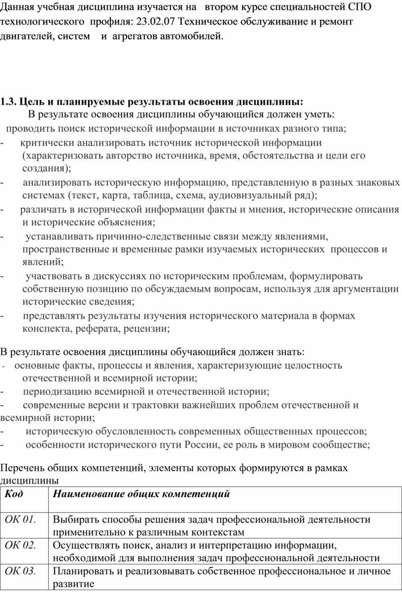 Рабочая программа учебной дисциплины История разработана на основе Федерального государственного образовательного стандарта среднего профессионального образования (далее - ФГОС СПО) по специальности 23.02.07 Техническое обслуживание и ремонт двигателей, систем и агрегатов автомобилей.