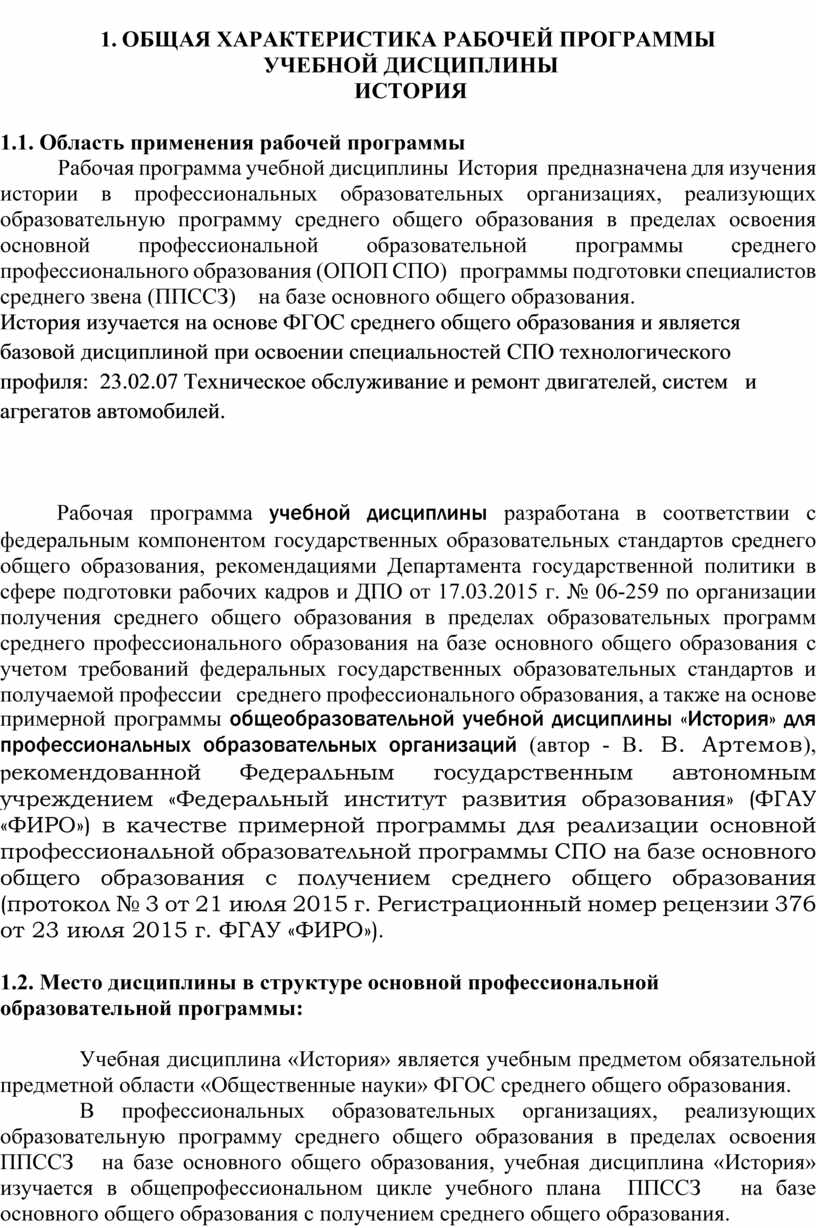 Рабочая программа учебной дисциплины разработана в соответствии с федеральным компонентом государственных образовательных стандартов среднего общего образования, рекомендациями Департамента государственной политики в сфере подготовки рабочих кадров и ДПО от 17.03.2015 г. № 06-259 по организации получения среднего общего образования в пределах образовательных программ среднего профессионального образования на базе основного общего образования с учетом требований федеральных государственных образовательных стандартов и получаемой профессии среднего профессионального образования, а также на основе примерной программы общеобразовательной учебной дисциплины «История» для профессиональных образовательных организаций (автор - В. В. Артемов), рекомендованной Федеральным государственным автономным учреждением «Федеральный институт развития образования» (ФГАУ «ФИРО») в качестве примерной программы для реализации основной профессиональной образовательной программы СПО на базе основного общего образования с получением среднего общего образования (протокол № 3 от 21 июля 2015 г. Регистрационный номер рецензии 376 от 23 июля 2015 г. ФГАУ «ФИРО»).