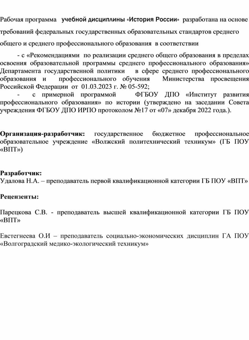 Рабочая программа учебной дисциплины «История России» разработана на основе требований федеральных государственных образовательных стандартов среднего общего и среднего профессионального образования в соответствии