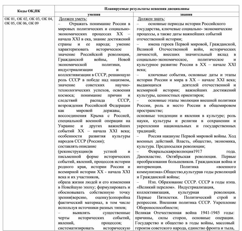Должен уметь: - Отражать понимание России в мировых политических и социально- экономических процессах XX – начала XXI в ека, знание достижений страны и ее народа; умение характеризовать историческое значение Российской революции, Гражданской войны, Новой экономической политики, индустриализации и коллективизации в СССР, решающую роль СССР в победе над нацизмом, значение советских научно-технологических успехов, освоения космоса; понимание причин и следствий распада СССР, возрождения Российской Федерации как мировой державы, воссоединения Крыма с Россией, специальной военной операции на Украине и других важнейших событий XX – начала XXI века; особенности развития культуры народов СССР (России); составлять описание (реконструкцию)в устной и письменной форме исторических событий, явлений, процессов истории родного края, истории России и всемирной истории XX - начала XXI века и их участников, образа жизни людей и его изменения в Новейшую эпоху; формулировать и обосновывать собственную точку зрения(версию, оценку)сопоройна фактический материал, в том числе используя источники разных типов; - выявлять существенные черты исторических событий, явлений, процессов; систематизировать историческую информацию в соответствии с заданными критериями; сравнивать изученные исторические события, явления, процессы; - осуществлять с соблюдением правил информационной безопасности поиск исторической информации по истории России и зарубежных стран XX – начала XXI века в справочной литературе, сети Интернет, СМИ для решения познавательных задач; оценивать полноту и достоверность информации с точки зрения ее соответствия исторической действительности; - анализировать текстовые, визуальные источники исторической информации, в том числе исторические карты/схемы, по истории России и зарубежных стран XX – начала XXI века; сопоставлять информацию, представленную в различных источниках; формализовать историческую информацию в виде таблиц, схем, графиков, диаграмм; - защищать историческую правду, не допускать умаления подвига народа при защите Отечества, готовность давать отпор фальсификациям российской истории; –демонстрировать патриотизм, гражданственность, уважение к своему Отечеству —многонациональному Российскому |