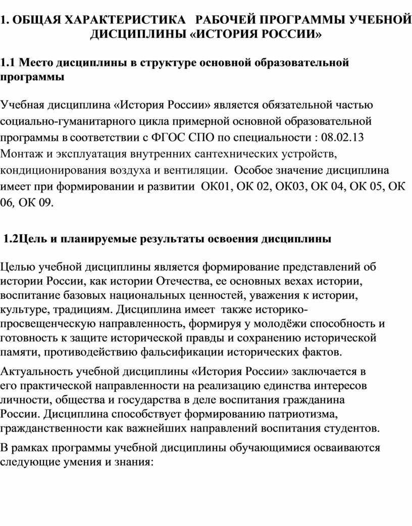 Учебная дисциплина «История России» является обязательной частью социально-гуманитарного цикла примерной основной образовательной программы в соответствии с ФГОС СПО по специальности : 08.02.13 Монтаж и эксплуатация внутренних сантехнических устройств, кондиционирования воздуха и вентиляции. Особое значение дисциплина имеет при формировании и развитии ОК01, ОК 02, ОК03, ОК 04, ОК 05, ОК 06, ОК 09.