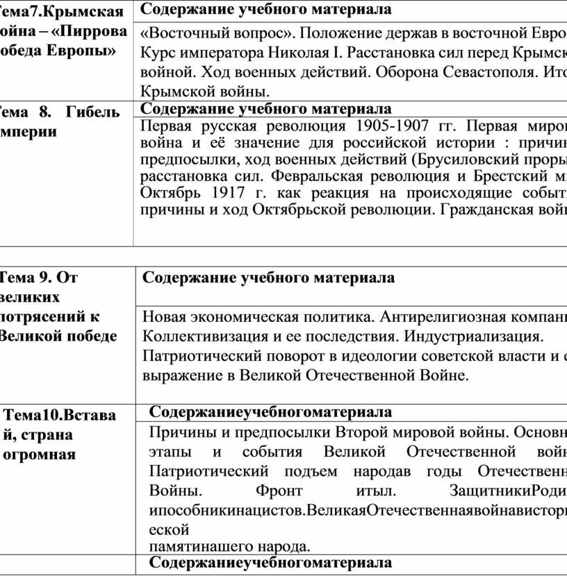 Должен знать: - основные периоды истории Российского государства, ключевые социально- экономические процессы, а также даты важнейших событий отечественной истории; - имена героев Первой мировой, Гражданской, Великой Отечественной войн, исторических личностей, внесших значительный вклад в социально-экономическое, политическое и культурное развитие России в XX – начале XXI века; - ключевые события, основные даты и этапы истории России и мира в XX – начале XXI века; выдающихся деятелей отечественной и всемирной истории; важнейших достижений культуры, ценностных ориентиров; - основные этапы эволюции внешней политики России, роль и место России в общемировом пространстве; основные тенденции и явления в культуре; роль науки, культуры и религии в сохранении и укреплении национальных и государственных традиций; - Россия накануне Первой мировой войны. Ход военных действий. Власть, общество, экономика, культура. Предпосылки революции; - Февральскаяреволюция1917 года. Двоевластие. Октябрьская революция. Первые преобразования большевиков. Гражданская война и интервенция. Политика «военного коммунизма».Общество,культурав годы революций и Гражданской войны; - Нэп. Образование СССР. СССР в годы нэпа. «Великий перелом». Индустриализация, коллективизация, культурная революция. Первые Пятилетки. Политический строй и репрессии. Внешняя политика СССР. Укрепление Обороноспособности; Великая Отечественная война 1941-1945 годы: причины, силы сторон, основные операции. Государство и общество в годы войны, массовый героизм советского народа, единство фронта и тыла, человек на войне. -Нацистский оккупационный режим, зверства захватчиков. Освободительная миссия Красной Армии. Победа над Японией. Решающий вклад СССР в Великую Победу. Защита памяти о Великой Победе; - СССР в 1945-1991 годы. Экономические развитие и реформы. Политическая система «развитого социализма». Развитие науки, образования, культуры. «Холодная война»и внешняя политика. СССР и мировая социалистическая система. Причины распада Советского Союза; - Российская Федерация в 1992-2022 годы. Становление новой России. Возрождение Российской Федерации как великой державы в XXI веке. Экономическая и социальная модернизация. Культурное пространство и повседневная жизнь. Укрепление обороноспособности. Воссоединение с Крымом и Севастополем. Специальная военная операция. Место России в современном мире; роли России в мировых политических и социально- экономических процессах с древнейших времен до настоящего времени. |