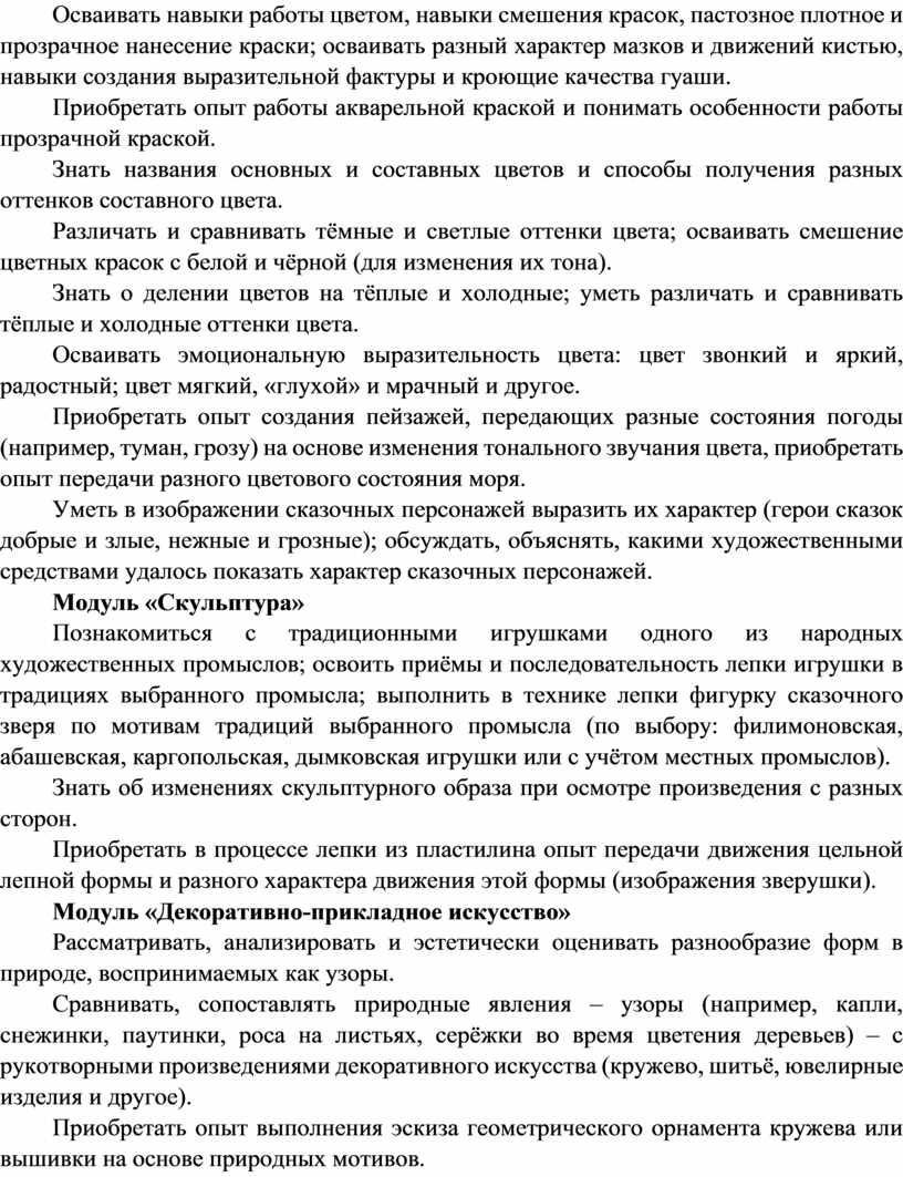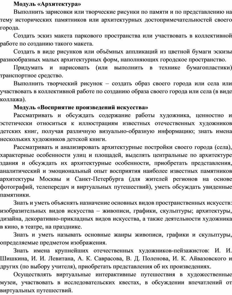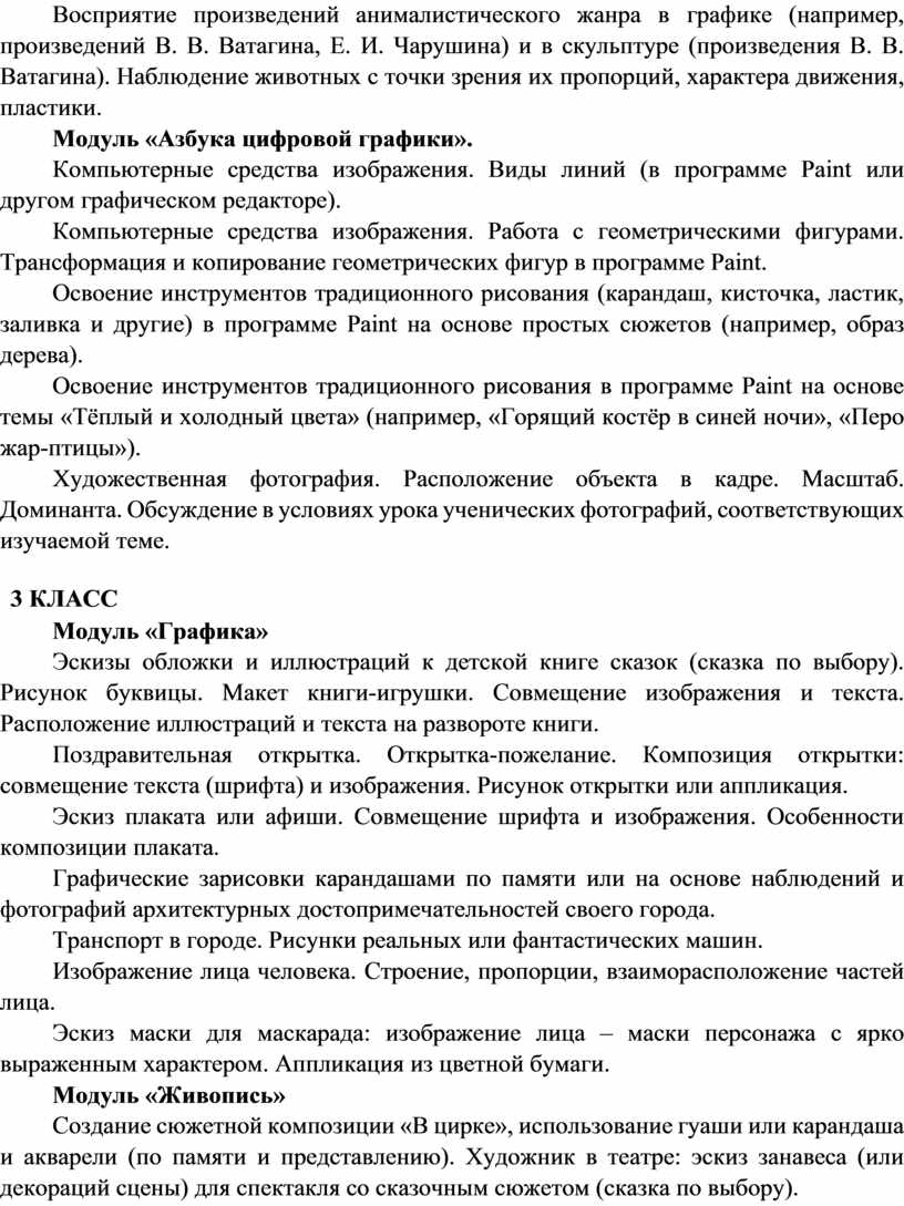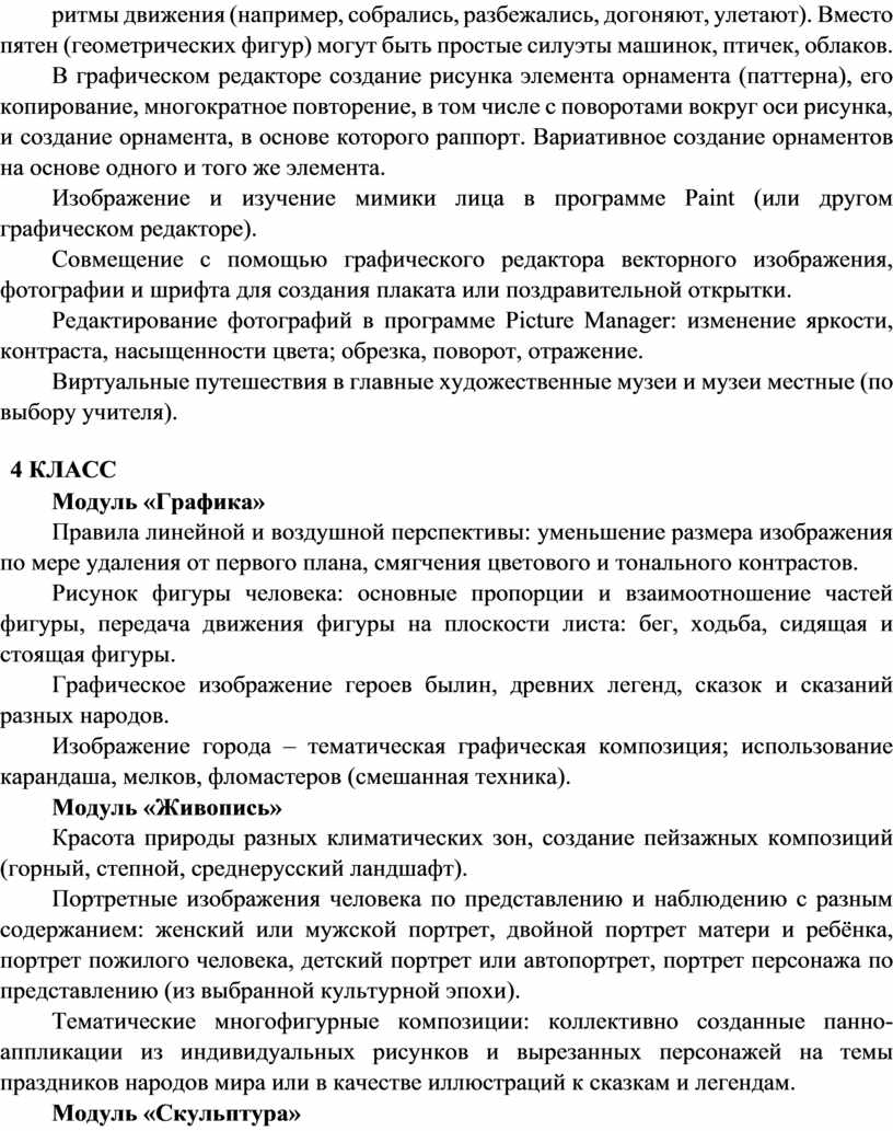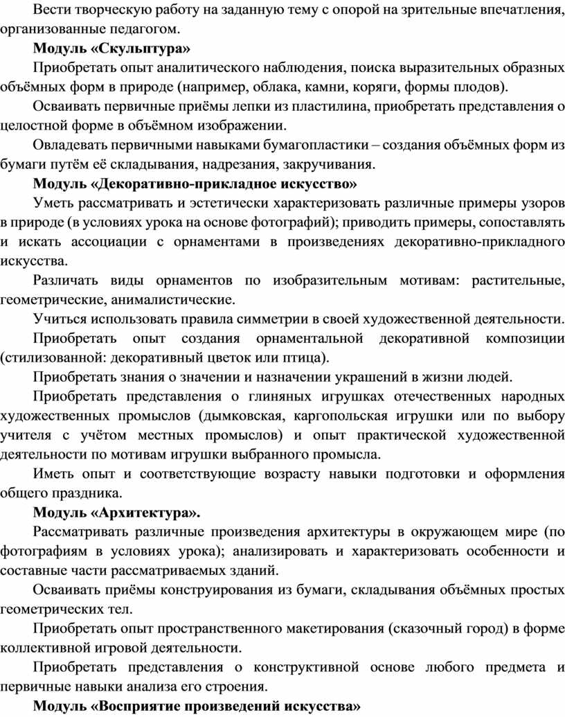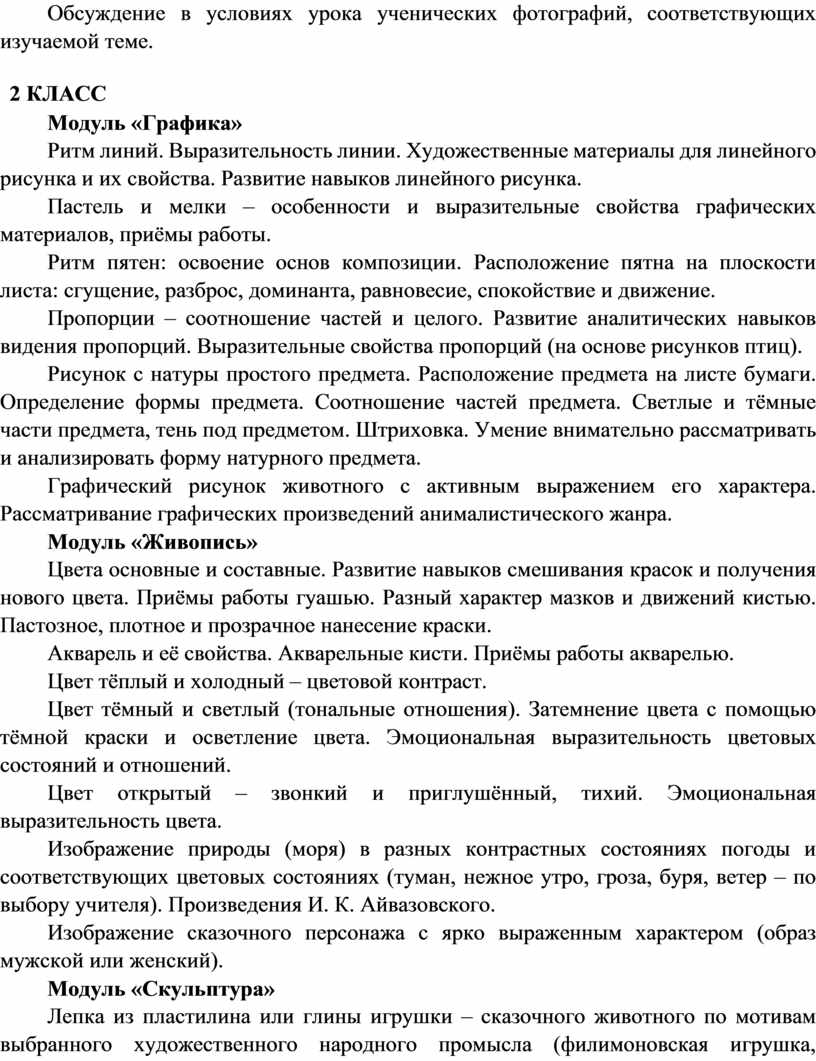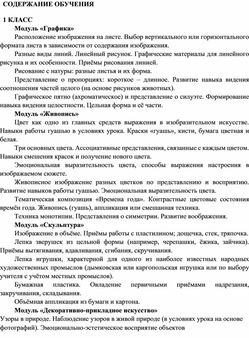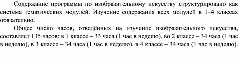 Содержание программы по изобразительному искусству структурировано как система тематических модулей. Изучение содержания всех модулей в 1–4 классах обязательно.