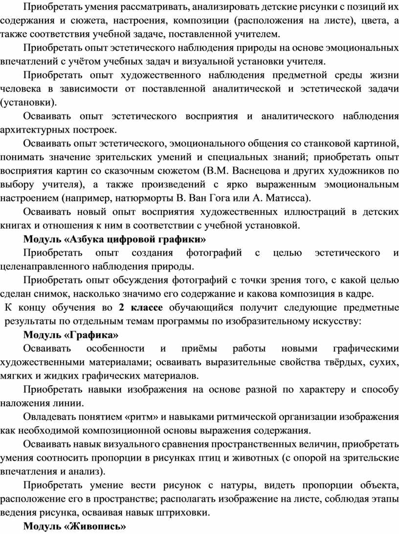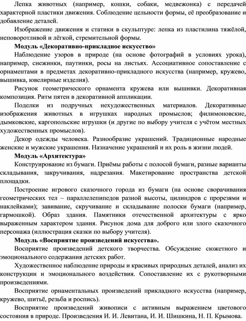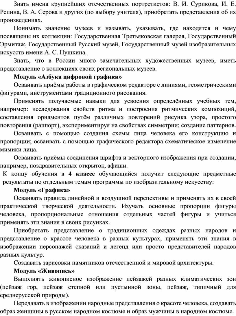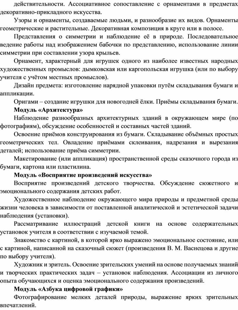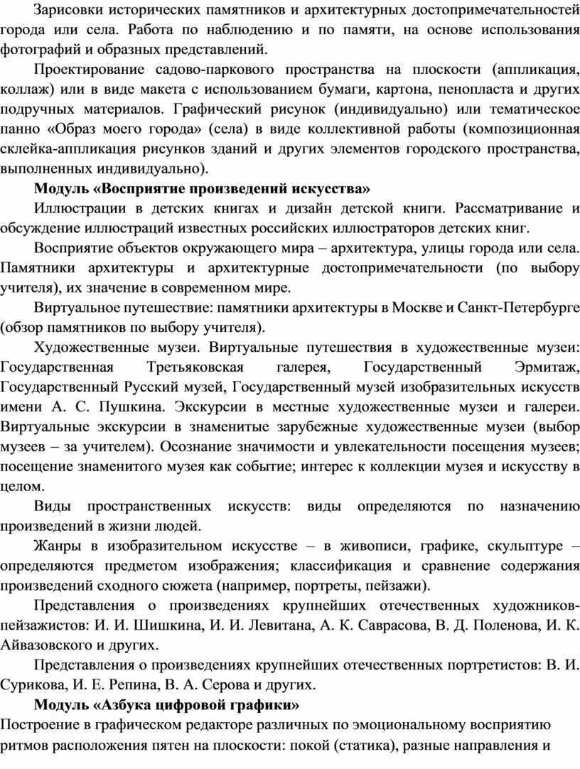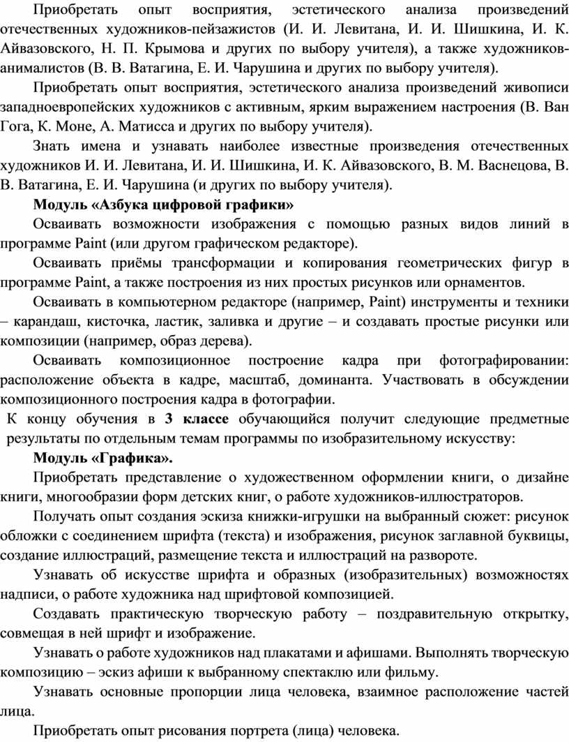 Содержание программы по изобразительному искусству структурировано как система тематических модулей. Изучение содержания всех модулей в 1–4 классах обязательно.