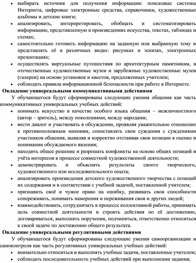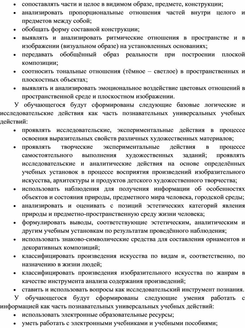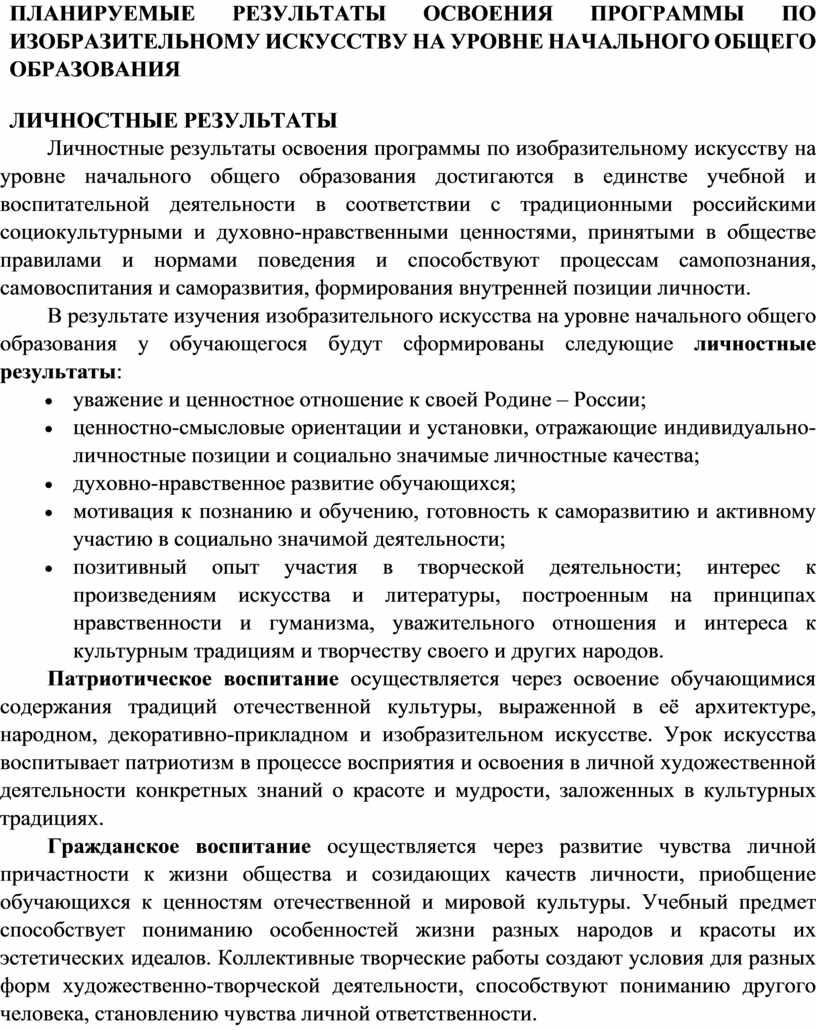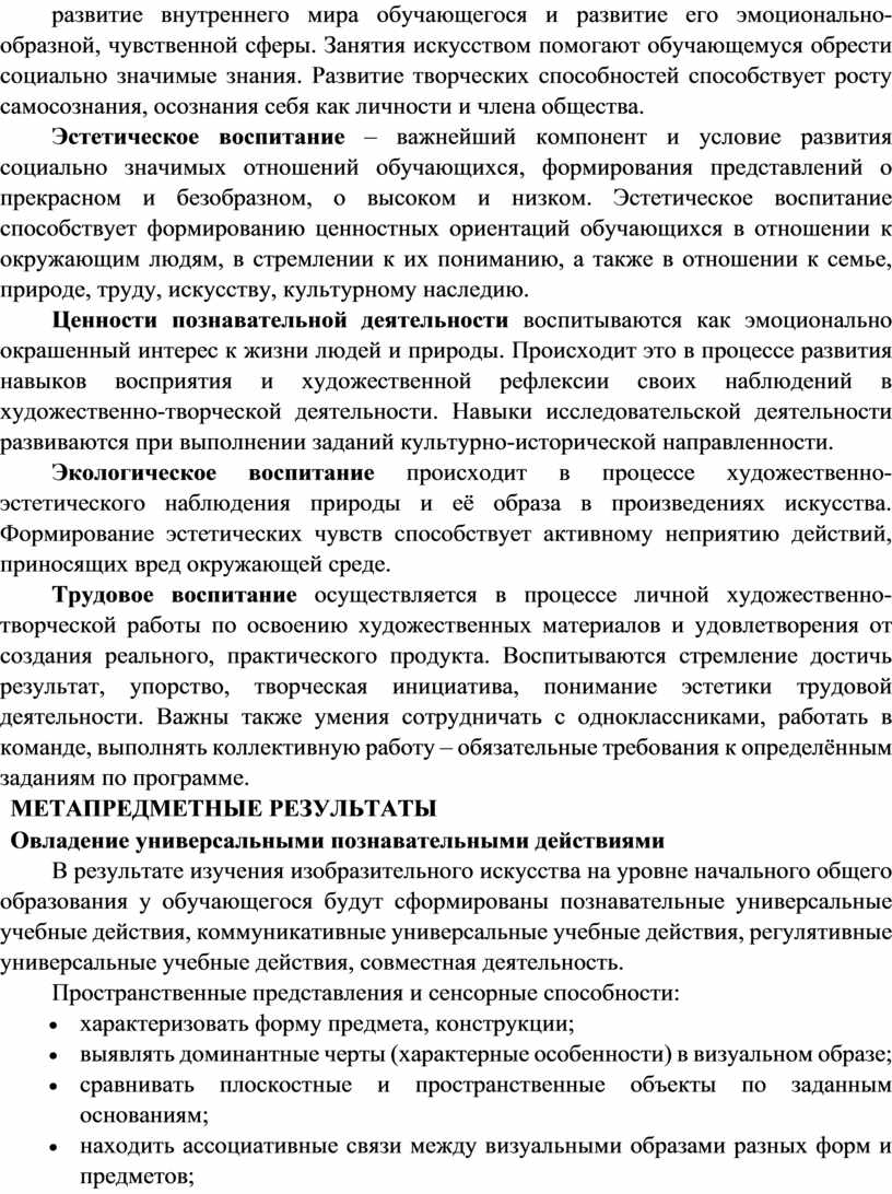 Программа по изобразительному искусству на уровне начального общего образования составлена на основе требований к результатам освоения основной образовательной программы начального общего образования ФГОС НОО, а также ориентирована на целевые приоритеты духовно-нравственного развития, воспитания и социализации обучающихся, сформулированные в федеральной рабочей программе воспитания.