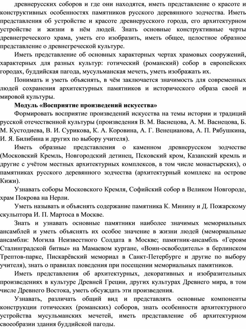 Важнейшей задачей является формирование активного, ценностного отношения к истории отечественной культуры, выраженной в её архитектуре, изобразительном искусстве, в национальных образах предметно-материальной и пространственной среды, в понимании красоты человека.