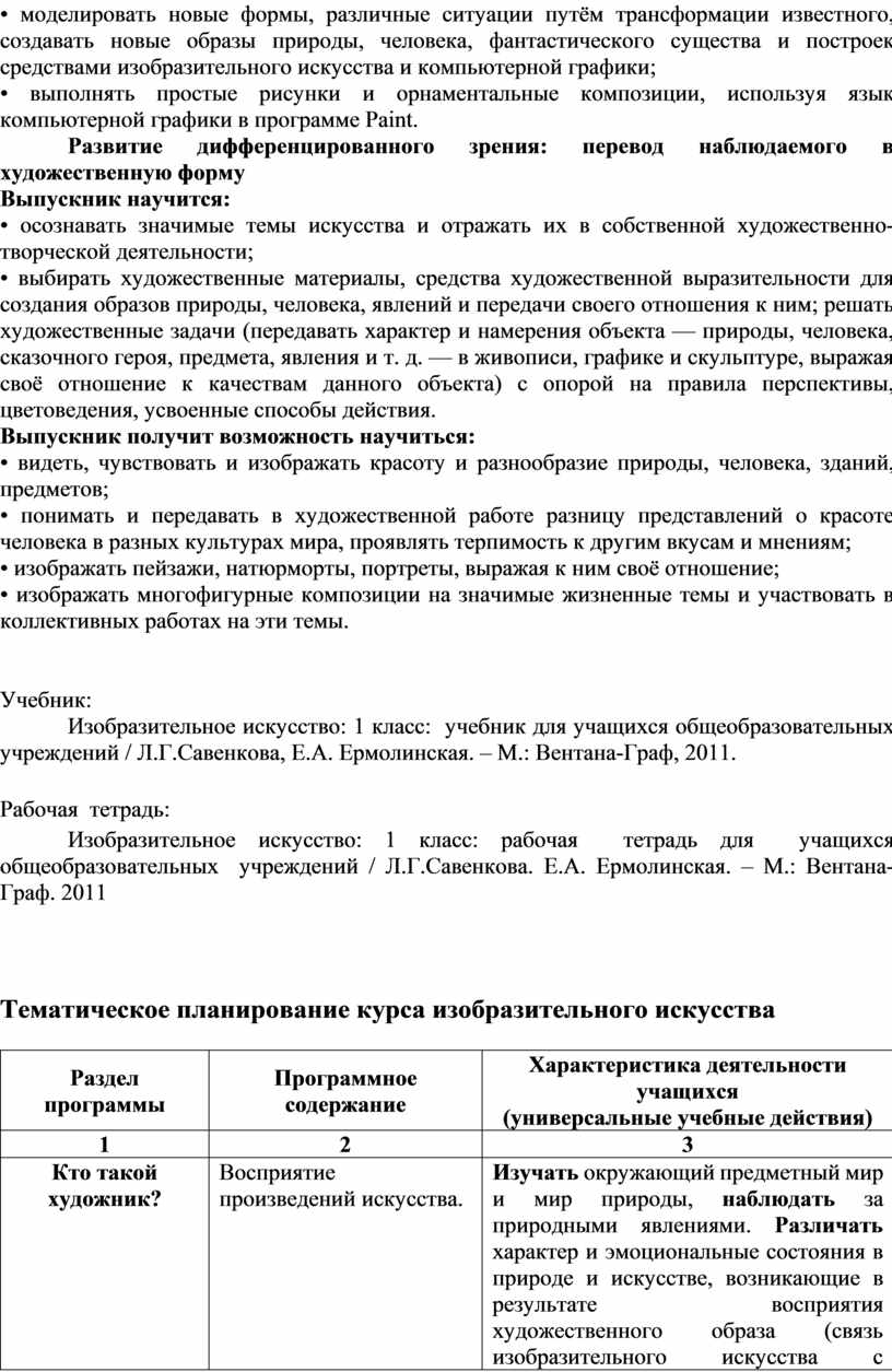 Рабочая программа курса «Изобразительное искусство» составлена на основе авторской программы Л.Г.Савенкова «Изобразительное искусство» и в соответствии с ФГОС НОО. Данная авторская программа основывается на концепции образовательной области «Искусство», соответствует Базисному учебному плану общеобразовательных учреждений России и допущена Министерством образования РФ.