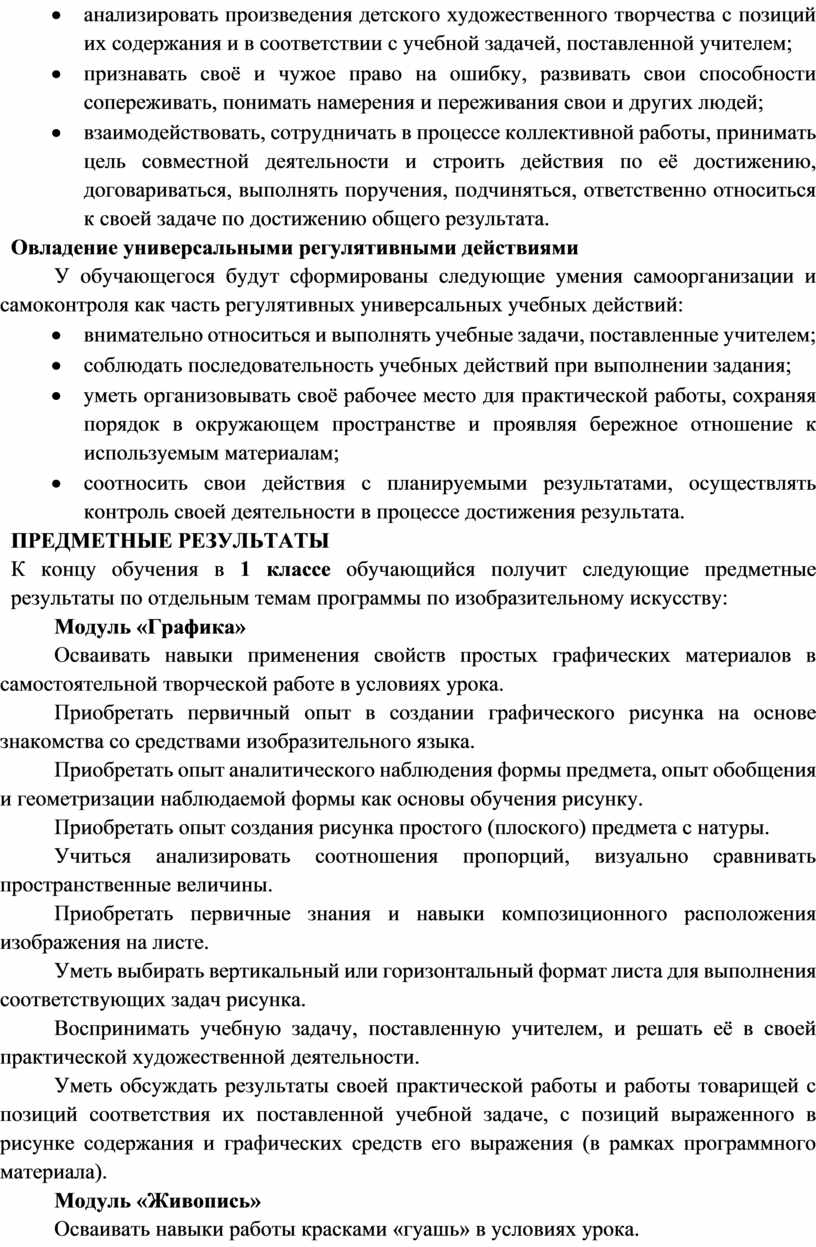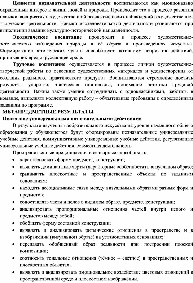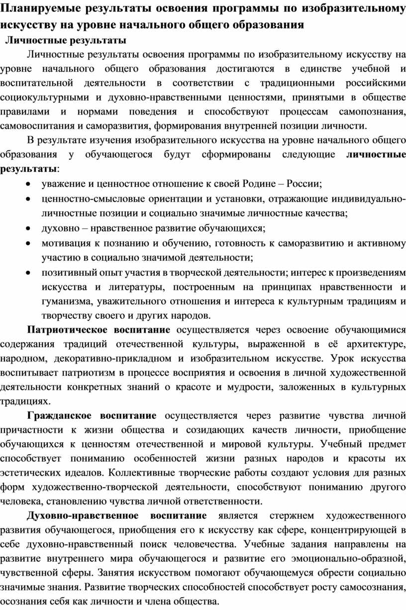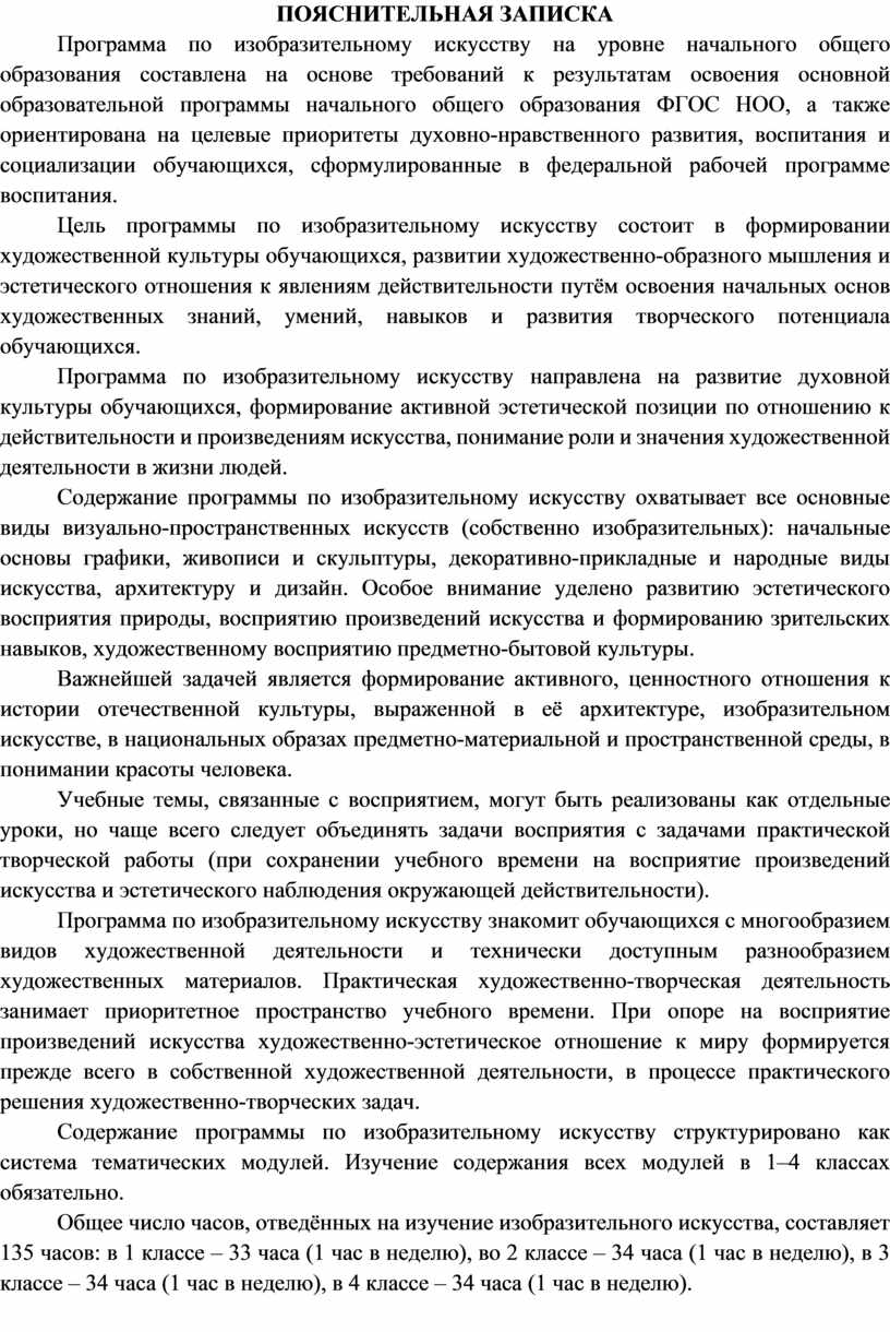 Программа по изобразительному искусству на уровне начального общего образования составлена на основе требований к результатам освоения основной образовательной программы начального общего образования ФГОС НОО, а также ориентирована на целевые приоритеты духовно-нравственного развития, воспитания и социализации обучающихся, сформулированные в федеральной рабочей программе воспитания.