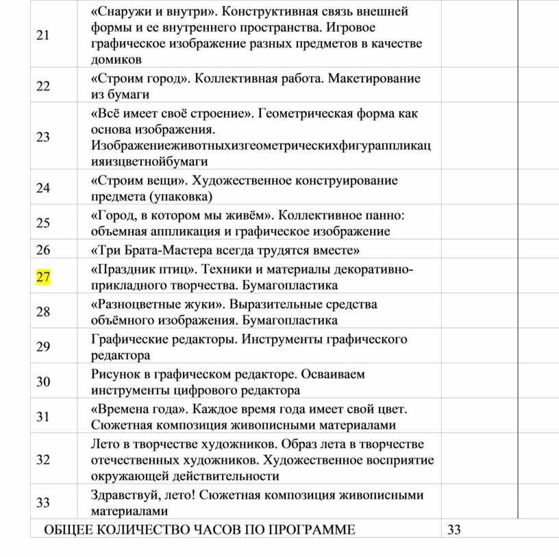 Общее число часов, отведённых на изучение изобразительного искусства, составляет 135 часов: в 1 классе – 33 часа (1 час в неделю), во 2 классе – 34 часа (1 час в неделю), в 3 классе – 34 часа (1 час в неделю), в 4 классе – 34 часа (1 час в неделю).