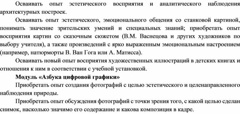 Эстетическое воспитание – важнейший компонент и условие развития социально значимых отношений обучающихся, формирования представлений о прекрасном и безобразном, о высоком и низком. Эстетическое воспитание способствует формированию ценностных ориентаций обучающихся в отношении к окружающим людям, в стремлении к их пониманию, а также в отношении к семье, природе, труду, искусству, культурному наследию.