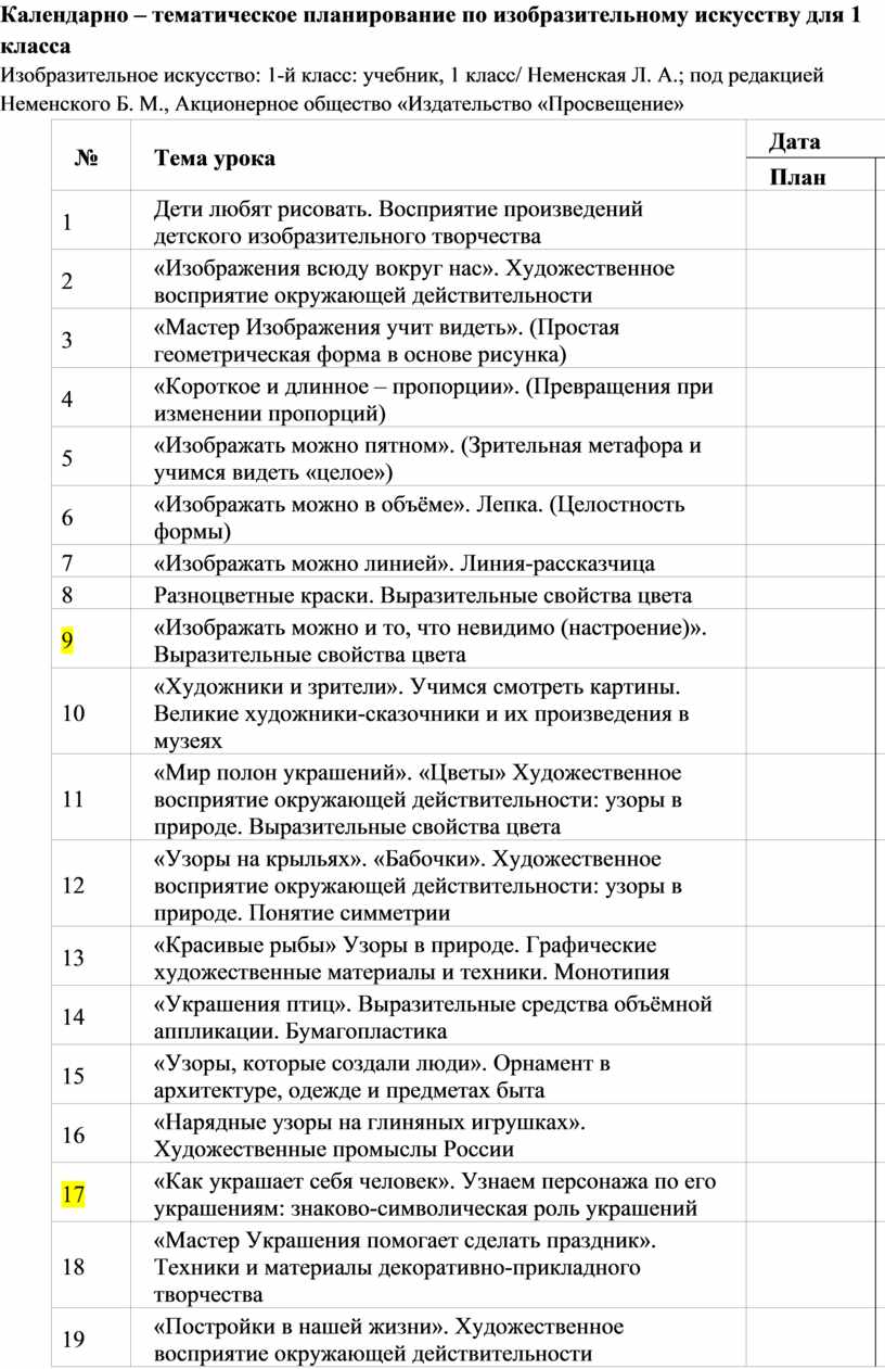 Календарно – тематическое планирование по изобразительному искусству для 1 класса