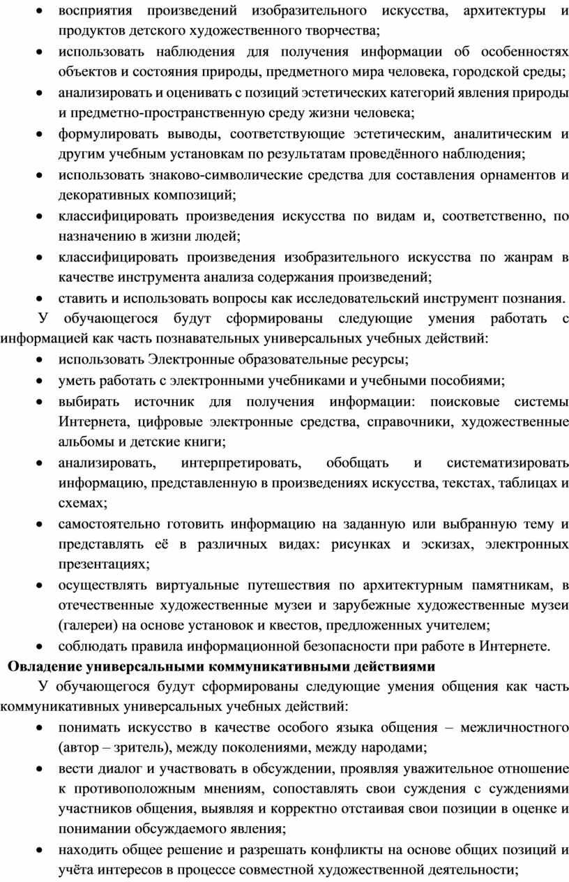 В результате изучения изобразительного искусства на уровне начального общего образования у обучающегося будут сформированы познавательные универсальные учебные действия, коммуникативные универсальные учебные действия, регулятивные универсальные учебные действия, совместная деятельность.