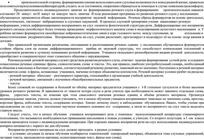 Продолжительность индивидуального занятия по формированию речевого слуха и формированию произносительных навыков составляет 20 минут: по10 минут на каждую часть занятия. В ходе реализации программы по развитию речевого слуха у неслышащих обучающихся проявляются общие закономерности восприятия звуковой информации. Речевые образы формируются на основе зрительных, кинестетических, тактильно-вибрационных и слуховых ощущений. В процессе слуховой тренировки ученик накапливает речевую информацию, учится дифференцированно воспринимать на слух элементы фонетической структуры речи. Дифференцированное восприятие речевого сигнала способствует более точному проведению морфологического анализа слова и моделирования целостного высказывания. У ребёнка активно формируются своеобразные нейрокинестетические связи в коре головного мозга между слуховыми, зрительными и кинестетическими раздражителями. Воспринимая речь на слух, ученик распознаёт, прогнозирует и моделирует её на основе подражания и догадки.