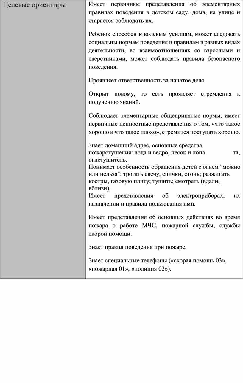Имеет первичные представления об элементарных правилах поведения в детском саду, дома, на улице и старается соблюдать их. Ребенок способен к волевым усилиям, может следовать социальны нормам поведения и правилам в разных видах деятельности, во взаимоотношениях со взрослыми и сверстниками, может соблюдать правила безопасного поведения. Проявляет ответственность за начатое дело. Открыт новому, то есть проявляет стремления к получению знаний. Соблюдает элементарные общепринятые нормы, имеет первичные ценностные представления о том, «что такое хорошо и что такое плохо», стремится поступать хорошо. Знает домашний адрес, основные средства пожаротушения: вода и ведро, песок и лопата, огнетушитель. Понимает особенность обращения детей с огнем "можно или нельзя": трогать свечу, спички, огонь; разжигать костры, газовую плиту; тушить; смотреть (вдали, вблизи). Имеет представления об электроприборах, их назначении и правила пользования ими. Имеет представления об основных действиях во время пожара о работе МЧС, пожарной службы, службы скорой помощи. Знает правил поведения при пожаре. Знает специальные телефоны («скорая помощь 03», «пожарная 01», «полиция 02»). |