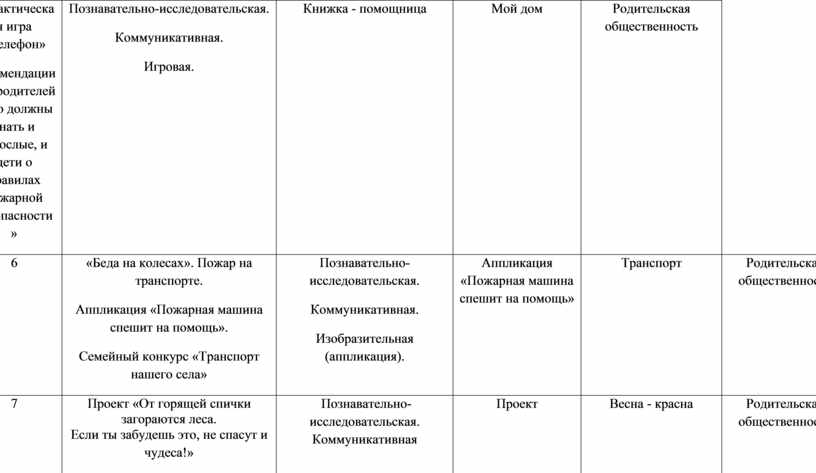 1. Формировать у детей представления о правилах пожарной безопасности. 2. Воспитывать навыки адекватного поведения в различных пожароопасных ситуациях. 3. Вовлечь родителей в профилактические противопожарные мероприятия. |