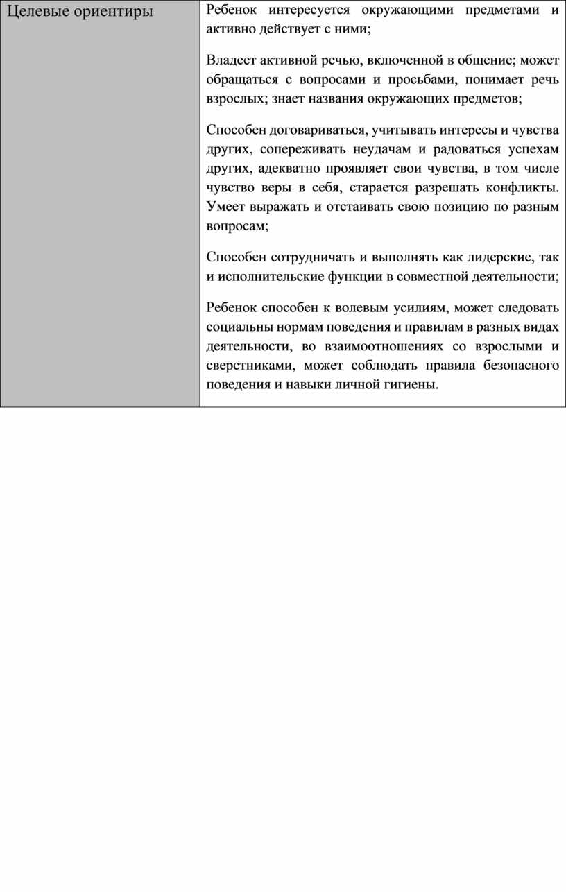 Ребенок интересуется окружающими предметами и активно действует с ними; Владеет активной речью, включенной в общение; может обращаться с вопросами и просьбами, понимает речь взрослых; знает названия окружающих предметов; Способен договариваться, учитывать интересы и чувства других, сопереживать неудачам и радоваться успехам других, адекватно проявляет свои чувства, в том числе чувство веры в себя, старается разрешать конфликты. Умеет выражать и отстаивать свою позицию по разным вопросам; Способен сотрудничать и выполнять как лидерские, так и исполнительские функции в совместной деятельности; Ребенок способен к волевым усилиям, может следовать социальны нормам поведения и правилам в разных видах деятельности, во взаимоотношениях со взрослыми и сверстниками, может соблюдать правила безопасного поведения и навыки личной гигиены. |