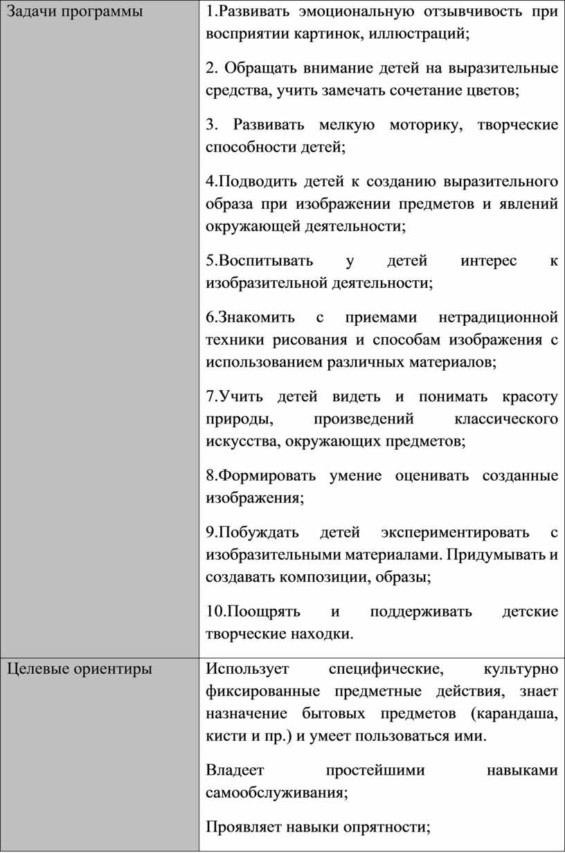 1.Развивать эмоциональную отзывчивость при восприятии картинок, иллюстраций; 2. Обращать внимание детей на выразительные средства, учить замечать сочетание цветов; 3. Развивать мелкую моторику, творческие способности детей; 4.Подводить детей к созданию выразительного образа при изображении предметов и явлений окружающей деятельности; 5.Воспитывать у детей интерес к изобразительной деятельности; 6.Знакомить с приемами нетрадиционной техники рисования и способам изображения с использованием различных материалов; 7.Учить детей видеть и понимать красоту природы, произведений классического искусства, окружающих предметов; 8.Формировать умение оценивать созданные изображения; 9.Побуждать детей экспериментировать с изобразительными материалами. Придумывать и создавать композиции, образы; 10.Поощрять и поддерживать детские творческие находки. |
