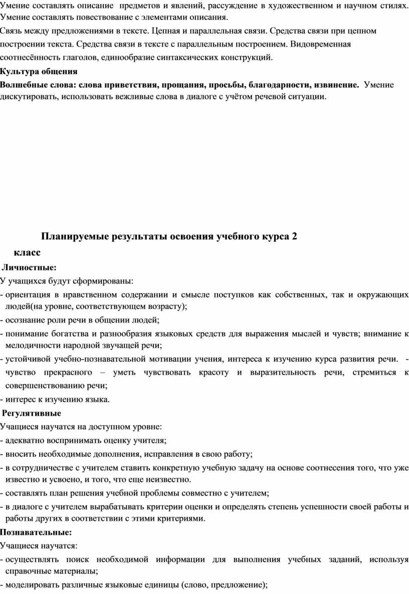 учебного курса «Развитие речи»