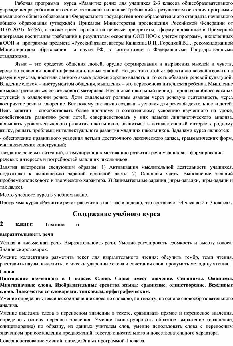 Рабочая программа курса «Развитие речи» для учащихся 2-3 классов общеобразовательного учреждения разработана на основе составлена на основе Требований к результатам освоения программы начального общего образования Федерального государственного образовательного стандарта начального общего образования (утверждён Приказом Министерства просвещения Российской Федерации от 31.05.2021г №286), а также ориентирована на целевые приоритеты, сформулированные в Примерной программе воспитания требований к результатам освоения ООП НОО с учётом программ, включённых в ООП и программы предмета «Русский язык», авторы Канакина В.П., Горецкий В.Г., рекомендованной Министерством образования и науки РФ, в соответствии с Федеральными Государственными стандартами.
