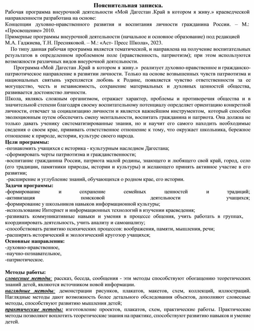 Программа «Мой Дагестан .Край в котором я живу.» реализует духовно-нравственное и гражданско- патриотическое направление в развитии личности. Только на основе возвышенных чувств патриотизма и национальных святынь укрепляется любовь к Родине, появляется чувство ответственности за ее могущество, честь и независимость, сохранение материальных и духовных ценностей общества, развивается достоинство личности.