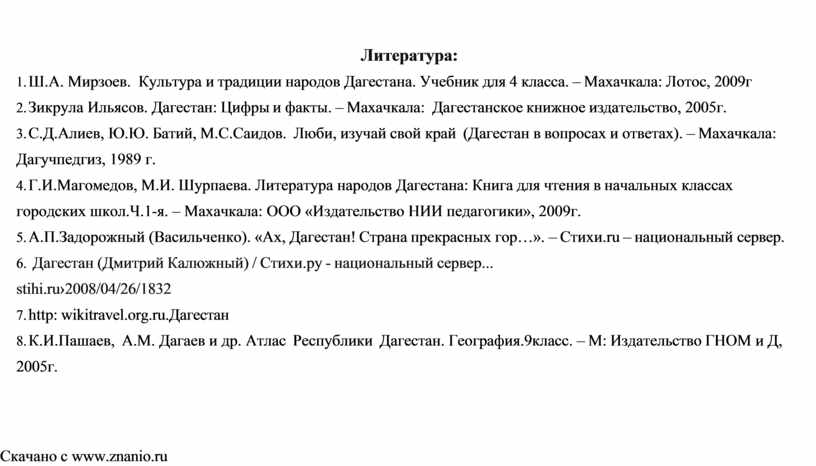 1. Ш.А. Мирзоев. Культура и традиции народов Дагестана. Учебник для 4 класса. – Махачкала: Лотос, 2009г