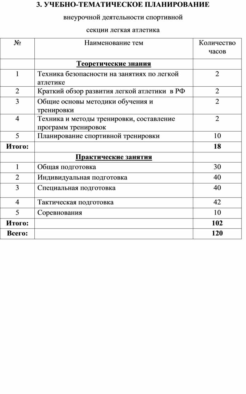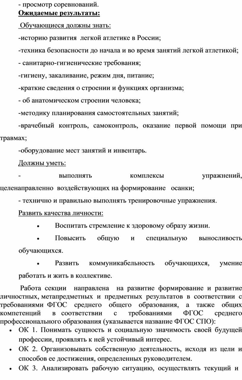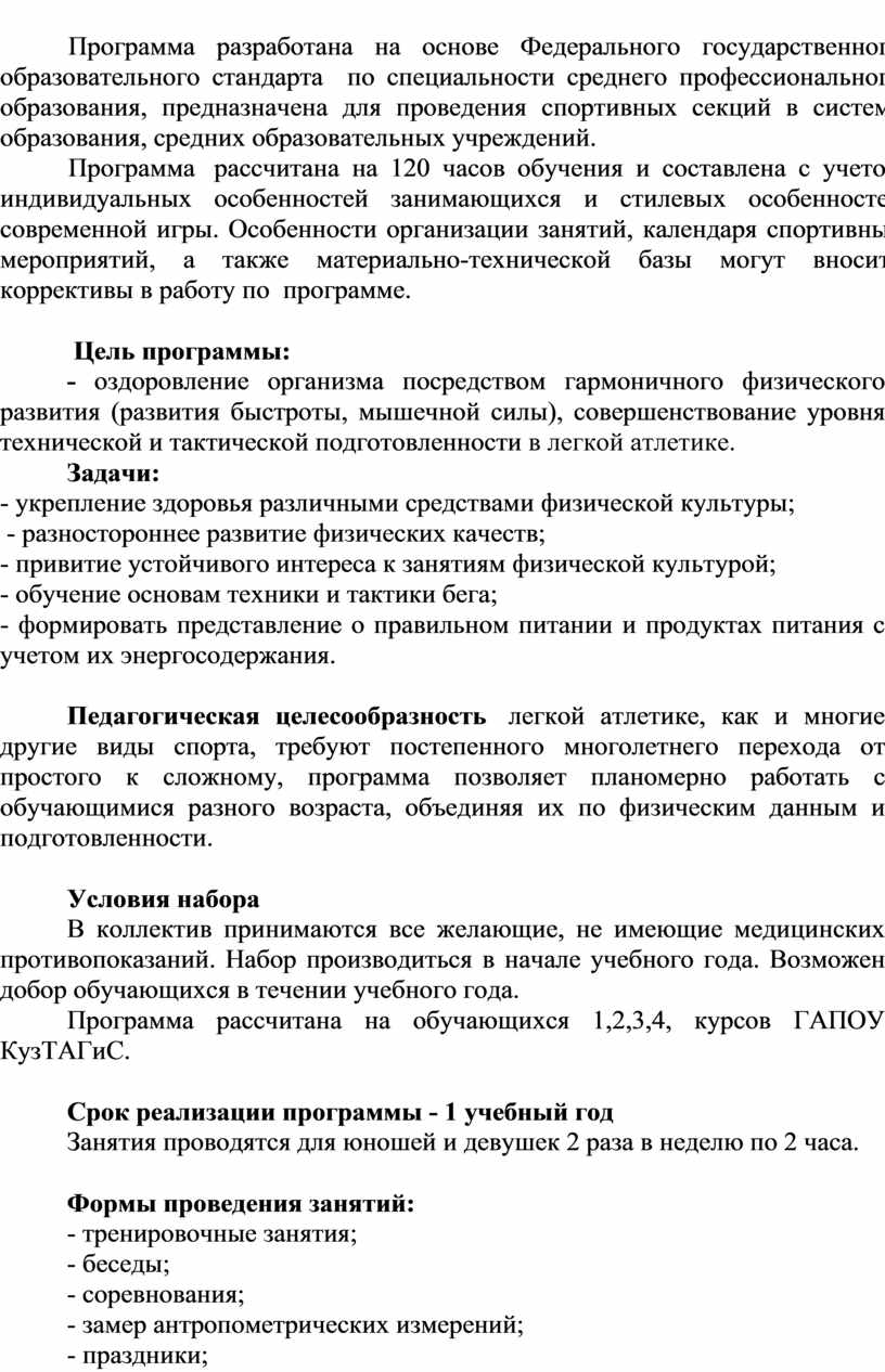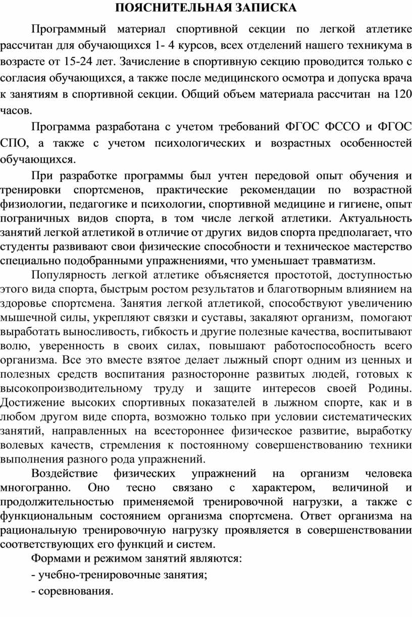 Программный материал спортивной секции по легкой атлетике рассчитан для обучающихся 1- 4 курсов, всех отделений нашего техникума в возрасте от 15-24 лет. Зачисление в спортивную секцию проводится только с согласия обучающихся, а также после медицинского осмотра и допуска врача к занятиям в спортивной секции. Общий объем материала рассчитан на 120 часов.