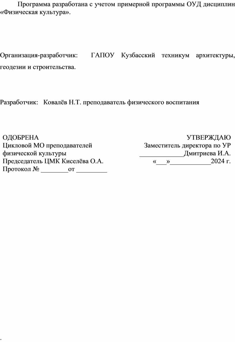 ОДОБРЕНА Цикловой МО преподавателей физической культуры Председатель ЦМК Киселёва О.А. Протокол № ________от _________ |