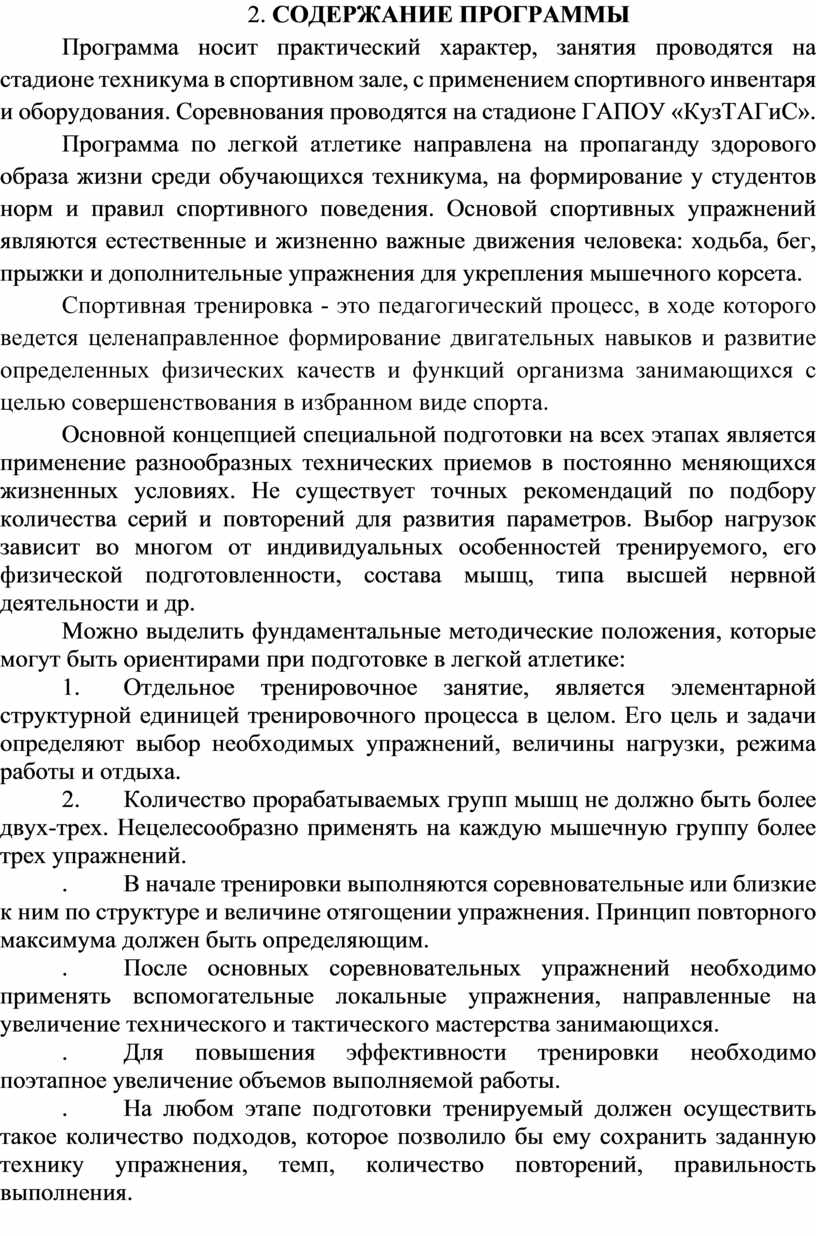 Программа по легкой атлетике направлена на пропаганду здорового образа жизни среди обучающихся техникума, на формирование у студентов норм и правил спортивного поведения. Основой спортивных упражнений являются естественные и жизненно важные движения человека: ходьба, бег, прыжки и дополнительные упражнения для укрепления мышечного корсета.